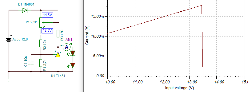 Két Led-et tettem sorba, mert a TL431 maradék feszültsége 2V körül van (Tina nem tud róla) és félő, hogy erre már világítani fog egy nagy fényerejű Led. De a Led nyitófeszültségétől függően egy dióda is megteszi kiegészítésnek. (A használni kívánt Led nyitófeszültségtől függően.)