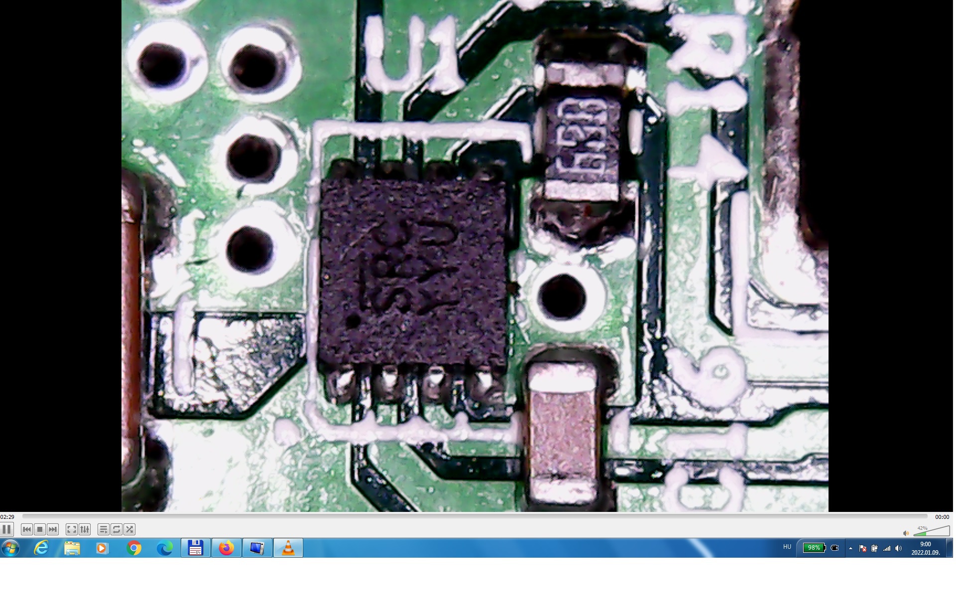 A nyáklapon volt egy töltést jelző led, ami ketté volt törve. Több mint 8 V-ot mértem a led helyén. Visszakövetve a vezetősávot ehhez az alkarészhez értem. Olyan forró, hogy nem állja a kezem.