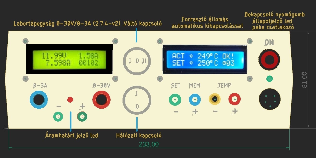 Az I-0-II váltókapcsoló mit csinál? (Azzal nem lehet kombinálni a DC on-off kapcsolót?) Nekem logikusabb lenne a feszültség-áram beállítást felcserélni, mert a feszültséget gyakrabban és "finomabban" fogod állítani, ezért annak talán jobb helye lenne a (bal) szélén, messzebb a főkapcsolótól. (Be- és kikapcsoláskor nem állítod el véletlenül a feszültséget, tehát kisebb az esélye annak, hogy más értékű lesz, mint amit vársz. A feszültség állításakor kisebb eséllyel kapcsolod ki.) A hozzászólás módosítva: Jan 5, 2022