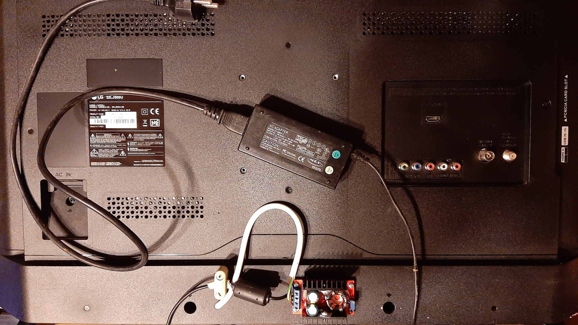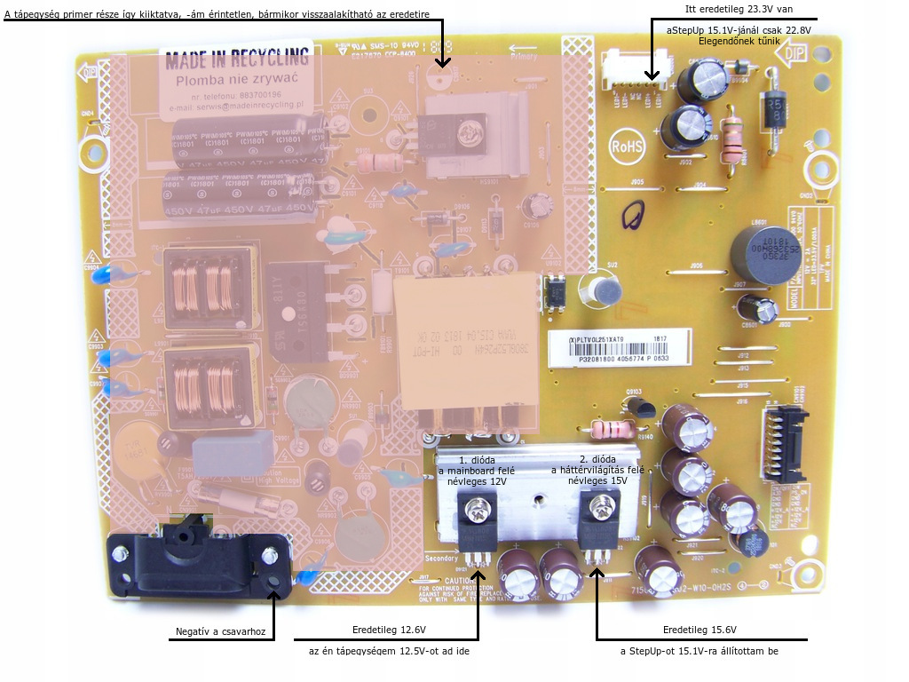 Az úgy volt, hogy egy ilyen készüléket kaptam, üzemképtelenül, csináljak vele, amit akarok. A tápegysége volt beteg, és olyan módon, hogy én azzal elakadtam, ám antiktelefon fórumtársunk önkéntesen segített, -a számomra kivitelezhetetlen dolgokat szuperül megcsinálta. (a Zanyámnál kitűnően működik) Ám, mivel én is sokat olvasgattam utána, hát láttam, hogy ez egy igen egyszerűre kihozott táp, összesen két feszültséget ad ki, egy 12V-ot a mainboard felé, és egy 15V-ot a háttérvilágítás felé (amiből némi furmány után végül 23,5V lesz a LED csatlakozásnál). A kész tápegységen meg is mértem, 12,6 és 15,6V-okat találtam mérni, a LED pozitívjánál 23,3V-ot. Ezután tudatosan kerestem LG lj500-ast, hogy kipróbálhassam, ha külső tápról táplálom meg a szekunder kört, ugyan működésre tudom-e bírni? (a12V-os részt már előzőleg próbáltam, az ment, csak háttérvilágítás úgy nincs). Végül találtam ugyanilyen készüléket, ugyanígy tápegységhibásat, adtam az első kettősdiódának 12V-ot, a másodiknak egy StepUp segítségével 15,1V-ot (az 1, kép szerint) -és működik! A StepUp nem igazán férne be a burkolat alá, hacsak nem takarítom le a primer részt, azonban azt nem akartam, egyrészt hátha fejlődök, és majd egyszer meg tudom azt is javítani, másrészt: hadd kapjon levegőt. A hátlapon lett a végső helye (2, kép). Jól működik így, a 12V/4,3A-es tápegység kézmeleg, a StepUp hideg 3 óra működés után is. Így ni Mindezt nem azért tettem közzé, mintha ez volna a TV javítás magasiskolája, azonban így az is megmentheti a készülékét még pár évre, aki nem tud kapcsolóüzemű tápegységet javítani, smd-t forrasztani. És mivel csak a kettősdiódák kimenetére lettek forrasztva a szálak, hát bármikor visszaalakítható az eredetire a tápegység. A hozzászólás módosítva: Dec 19, 2021