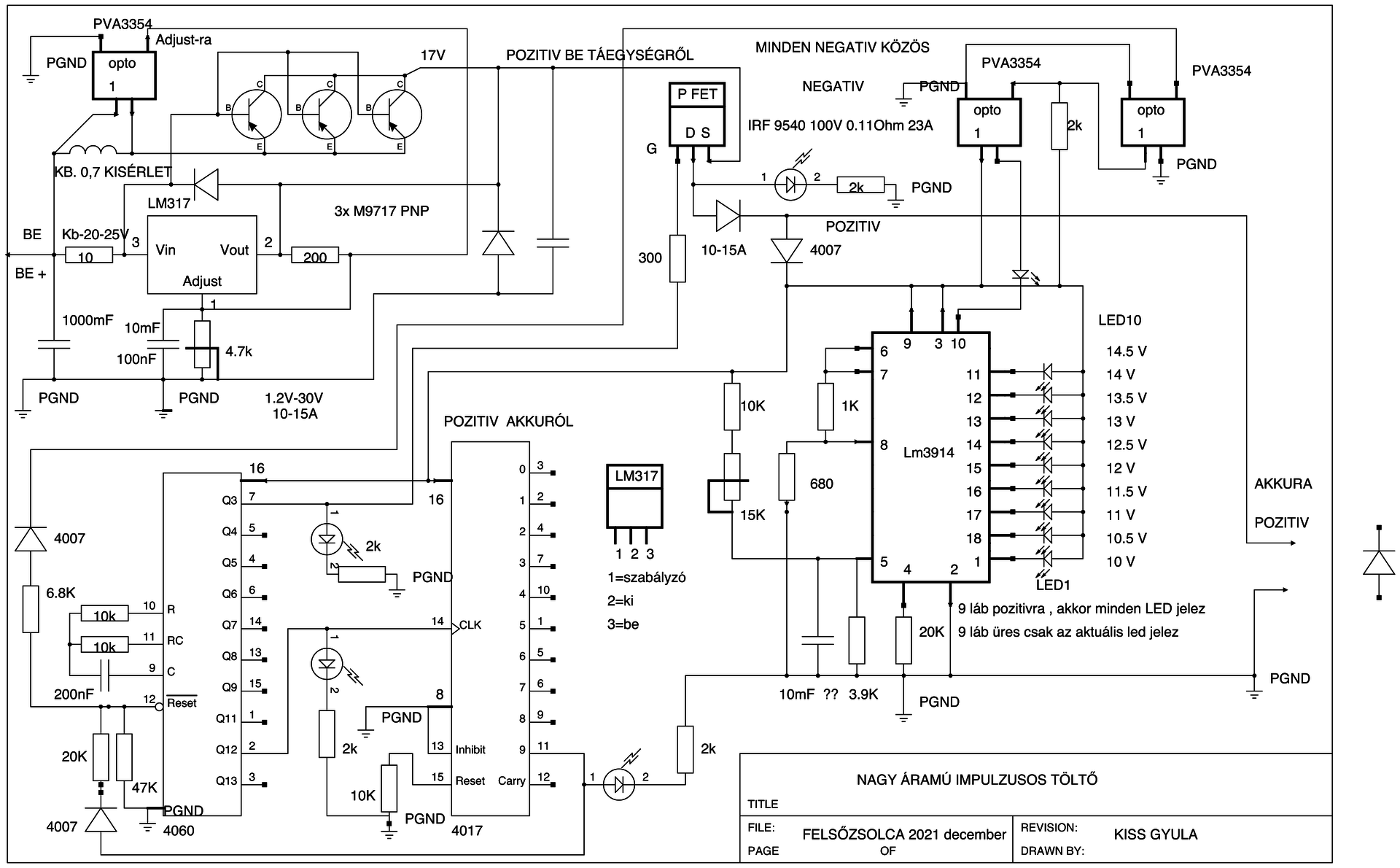 Visszatérve a CD 4060 állítja elő a FET vezérlő kb. 12Hz-es jelet. A 4017 számolja az impulzusokat és az idő egy tizedénél lekapcsolja a töltést és lekapcsolt állapotban megméri az akkumulátor feszültségét , ha nem éri el a 14,5V-ot