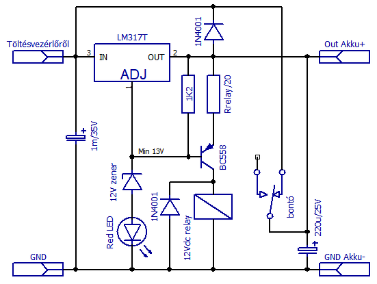 Kaptam egy kis kapcsolást a világhálón amit meg is építettem, teszi a dolgát. Szerintetek ez így használható? Raktam egy 2200µF-os elektrolit kondenzátort is a tápra így folyamatosan behúzva marad a relé ha a tápfeszültség 17V fölött van és bontja a villanypásztor táplálását. Igaz a 12V-os relé adott pillanatban 22V-ot kap de kibírta...