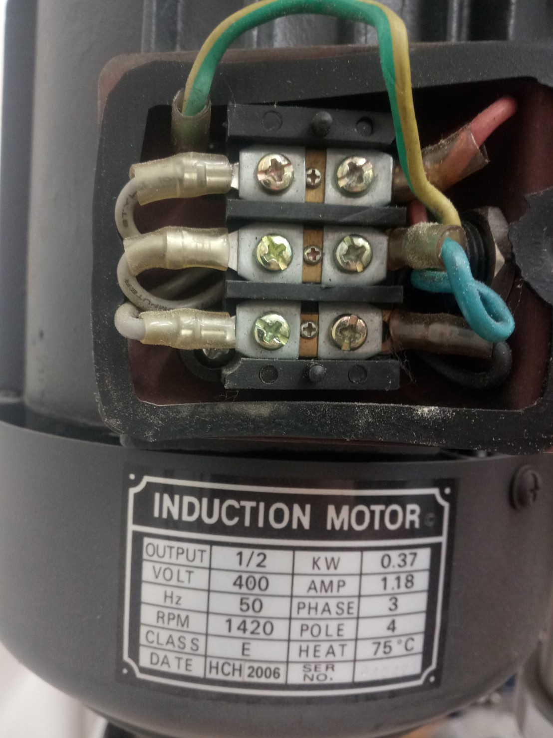 Amint az adattáblán látható, ez a holmi az egy fázisból ezzel a trükkel csinál 3x380V (3x400)-at. A pontos számolásoktól eltekintve a váltó üzemszerűen működtethet fix csillag kapcsolású motort. Főleg újratekert, vagy egyéb villanymotornál előfordulhat, hogy nem hoztak ki 6 kivezetést, így a delta kötés körülményes. Fel kell bontani a belső kötést és akkor lehet a kihozott vezetékek segítségével a deltát bekötni.