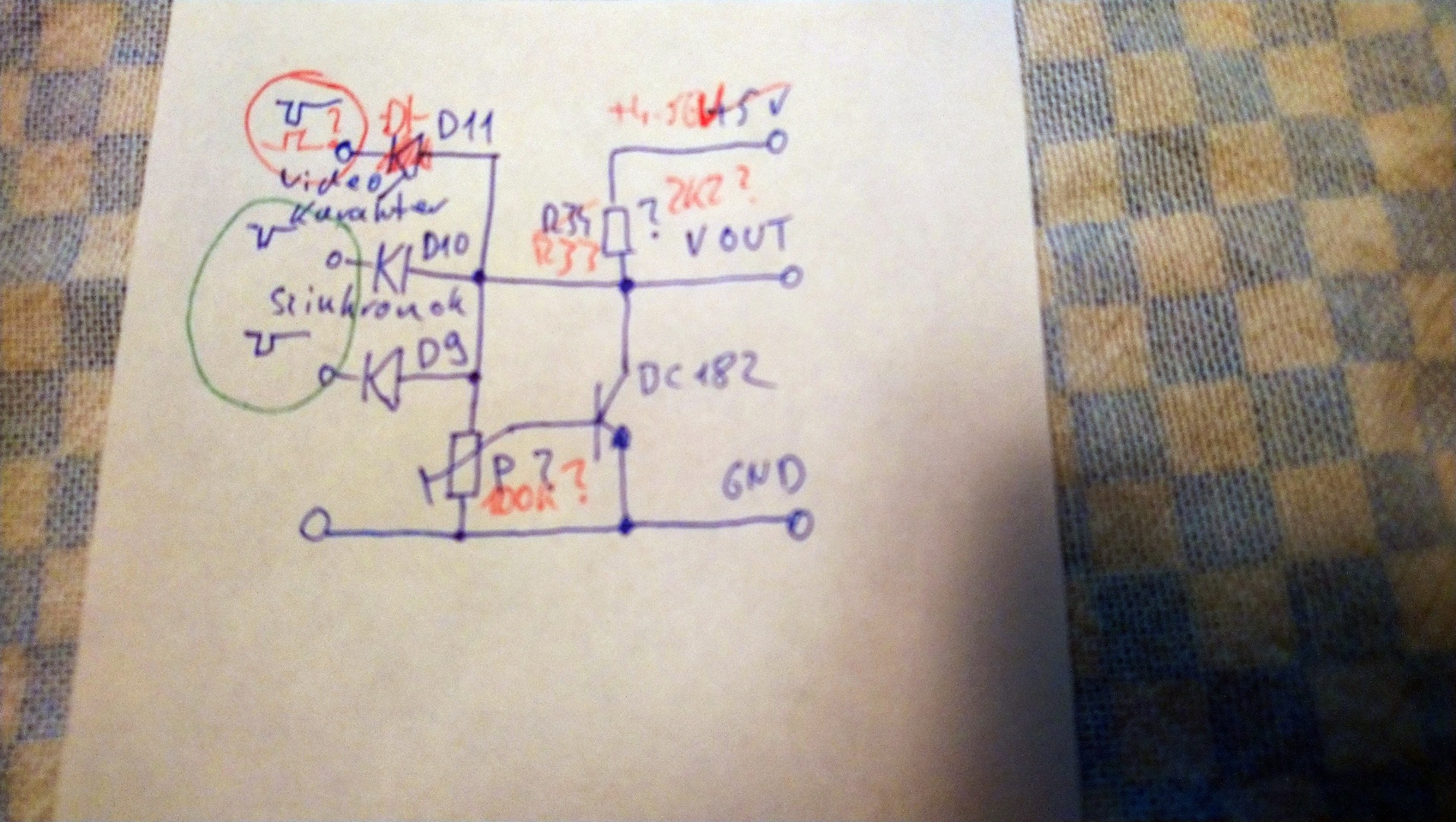 D11 jó irányban van bekötve? Az fordított mint a két szinkronjel diódája (Gafly rosszul rajzolta le). Amúgy én úgy állnék neki, hogy kivenném azokat a TTL IC-ket amik a video jelet és a szinkron jeleket adják. A kimenetre rákötnék egy akkora terhelő ellenállást mint amit a TV képvisel (75Ohm talán?). És ezek után vezetékekkel vagy a tápra, vagy a testre kötném ezeket a pontokat. Közben műszerrel mérném a kimeneti feszültséget.