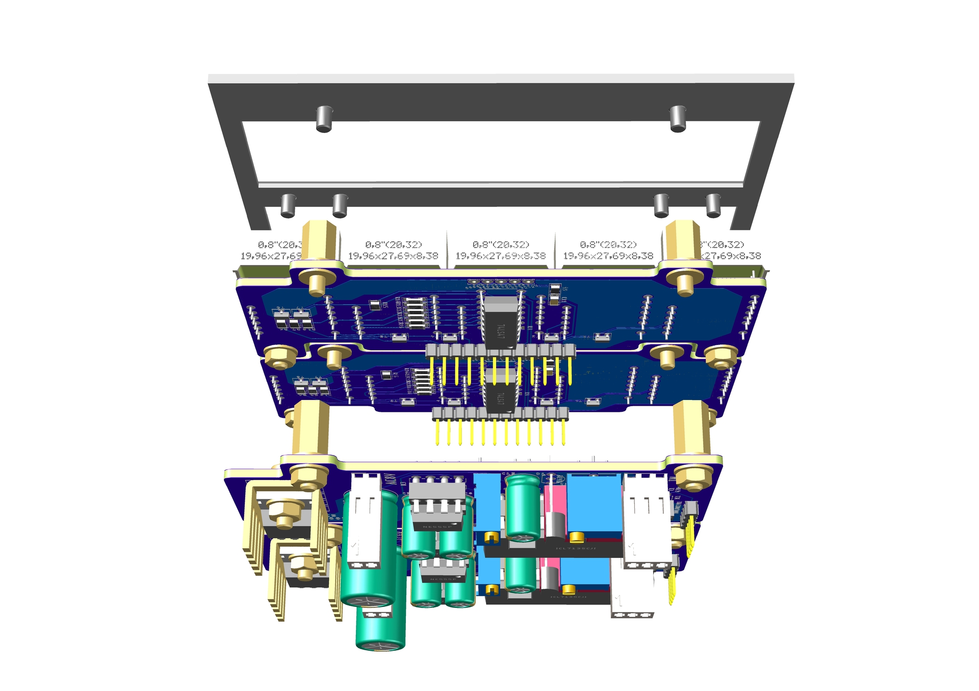 5 db ilyen számjegyet tartalmazó tokozás egymás mellé téve már néhány tizeddel nagyobb szélességi méretet eredményez(ne), mint a bűvös 100 mm-es határ. Továbbá meg kell oldani a két panel egymáshoz fogatását is, illetve az egész egységet is fel kell tudni fogatni akár az előlaphoz, akár egyéb szerelőkerethez. Ezek a furatok csak a kijelzők alatt és felett férhetnek el, viszonylag sok meddő helyet foglalnak el, és korlátozzák a mérőegység halmozhatóságát (akár szorosan egymás mellé tehetnénk több egységet is, de ha egymás alá-fölé lenne célszerű elhelyezni, akkor már nagyobb távolság lenne a számjegyek között. Mindezek miatt, kihasználva hogy a panelkontúr vágása része az alapárnak, kigondoltam egy viszonylag rafinált fül-elrendezést. Itt az alsó és felső fülek képesek egymás mellé csúszni, azaz sokkal közelebb kerülhetnek egymáshoz (ha ez szükséges) az egymás fölötti mérőegységek. Mellékesen, ha már hozzányúltam, akkor a stabilizátor bordáját is kisebbre és fekvőre cseréltem (elfért a növelt panelméreten), mert szinte egyáltalán nem melegszik. Azt bevállalnám, hogy a kijelzők egy icipicit lelógnak majd a kész panelról, annak fejében, hogy így belül tudok maradni a kedvezményes méreten. Ez még csak egy gondolat, ezért kérdezem az olvasókat, felmerül-e egyéb szempont, ami esetleg elkerülte a figyelmemet, vagy van-e más ok ami kifogásolható ebben a megoldásban? A panel alján is vannak alkatrészek. A mellékletek között a nézeti képeken 3 mérőegység panelt tettem egymás mellé, amivel azt próbáltam bemutatni, hogyan illeszkedik egymáshoz részben az alsó és felső panel, másik részben hogyan halmozhatóak az egységek. Ez a megoldás 37 mm távolságot garantál az egymás fölötti számjegyek középpontjai között, ami az egyébként 27,7 mm magas tokozások között így kb. 9 mm távolságot jelent, tehát ha szükséges nagyon közel tehetjük őket egymáshoz. A hozzászólás módosítva: Feb 24, 2022