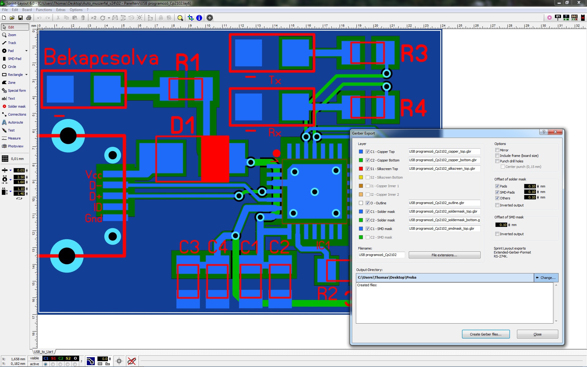 Voltak gondok, a furatfájlt is elméretezted valahogy, és az sem tett jót hogy alkatrész körvonak lelógott a panelről