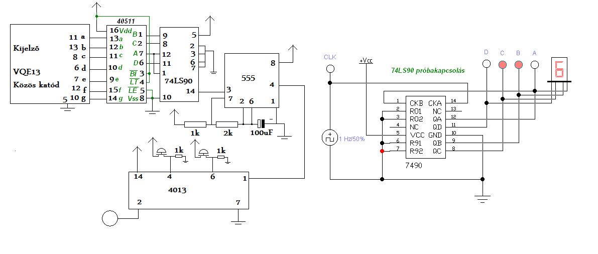 Elég új vagyok itt de máris egy kérdéssel fordulnék hozzátok. ![]() Arról lenne szó, hogy szeretnék egy olyan áramkört csinálni ami egy 7 szegmenses kijelzőn számol felfelé. A lényegi rész meg is van és az áramkör működik is csak az a baj, hogy az IC ami vezéri a számolást (74LS90) csak órajellel tud működni és én úgy akarom megcsinálni az áramkört, hogy az gombnyomásra számoljon. Ez nem is lenne nagy gond mert végül is nekem úgy is jó ha nem egy gomb lenyomására számol hanem pl. úgy, hogy lenyomok egy gombot és addig számol amíg a másik gombot meg nem nyomom, hogy álljon meg. Ezt így megpróbáltam megcsinálni de sajnos nem sok sikerrel. Az a lényeg, hogy van két IC az 555-ös ami az óra jelet generálja kb. 3 HZ és van egy Set Reset Latch IC CD4013 ami arra kéne, hogy két gomb nyomogatásával tulajdonképpen ki illetve be kapcsolja az 555-ös IC-t. Csak az a baj, hogy ez így nem akar menni. Úgy próbáltam, hogy az 555-ös IC (+) lábát egy tranzisztor emitterjéhez kötöttem és a tranzisztor kollektorát az ellem (+) végéhez. A bázist még nem kötöttem be a latch IC-hez csak megnéztem, hogy mi történik ha egyszerűen rákötöm az ellem (+) kimenetére. Az eredmény: Egyet lép a számolás és utána semmi. Nem tudom, hogy mi lehet a gond. Illetve csak tippem van. Valószínűleg nem így kéne ki illetve be kapcsolni a 555-öst?! De ha nem így akkor, hogy? Mindenkinek előre is köszönöm a válaszát! Bye!
