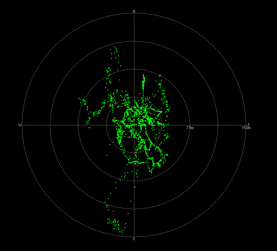 Egy MC60 modullal próbálkozok éppen. A képen több, mint három óra mérése eredménye látható. A mérés során az antennát nem mozdítottam el, ennek ellenére a mérések elmásznak. Érdekes, hogy K-Ny irányban nagyon kicsi a hiba, de É-D irányban folyamatos a mászkálás. (Ennek oka lehet, hogy az antenna az ablakpárkányon van, ahonnan csak a fél égbolt látszódik tisztán)