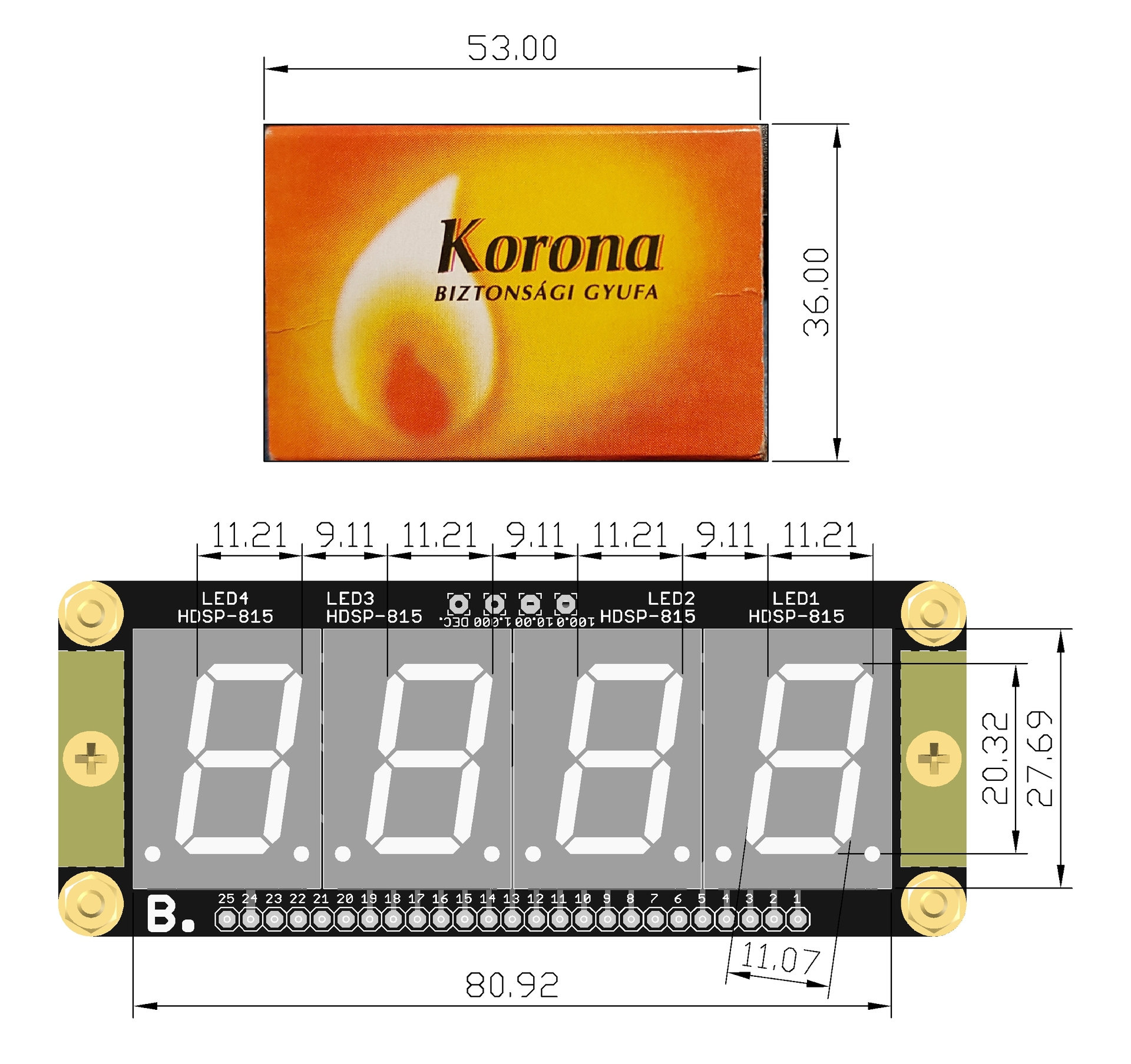A kijelző néhány méretét felírtam, és mellé tettem egy gyufásdobozt is az arányok jobb érzékelhetőségéért.