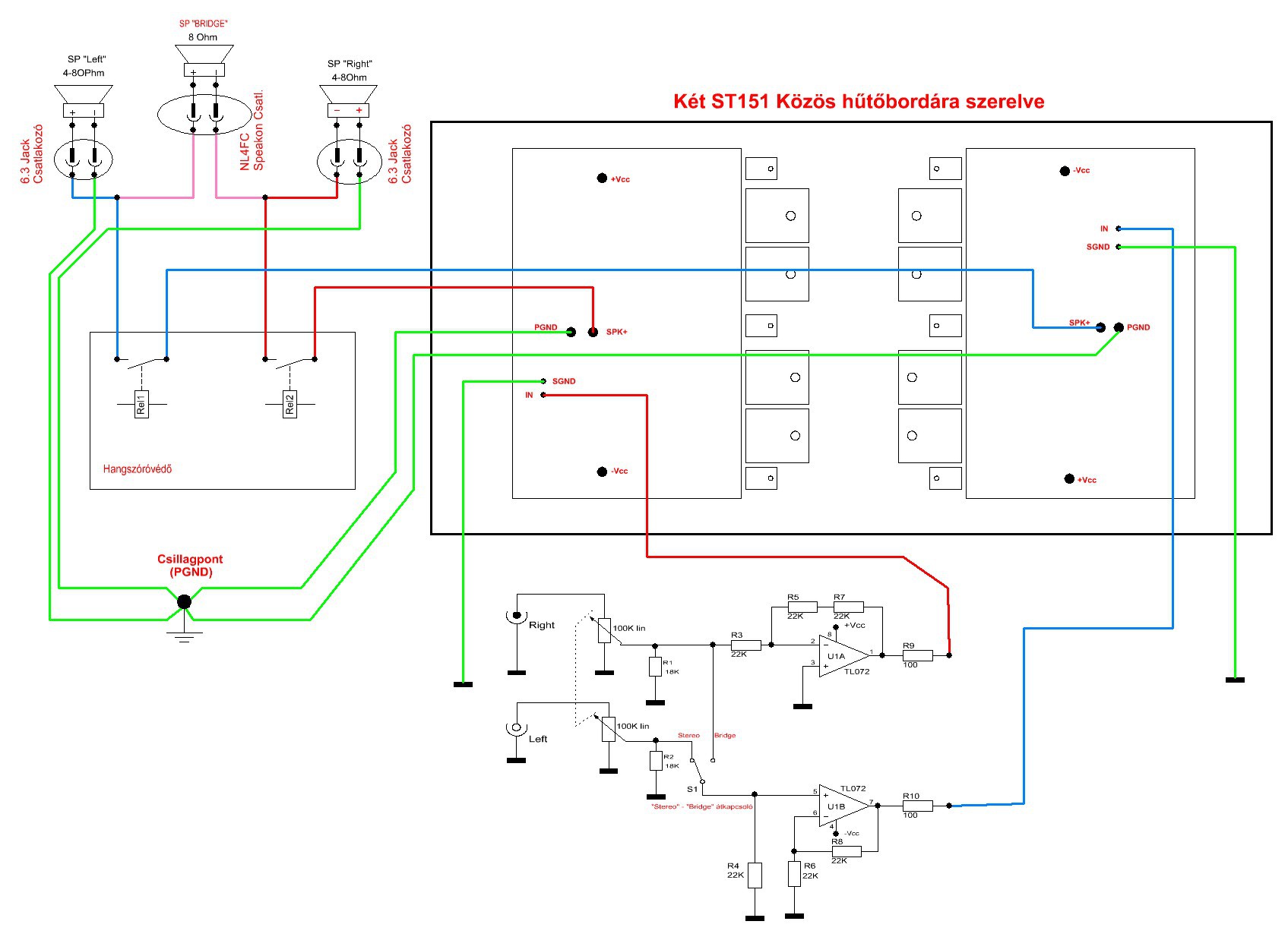 Összeállt az egyedi igényeimet kielégítő előerősítőm. Minden funkciója működik, de a jelszintek még igazításra szorulnak, ebben kérném a segítségeteket. Ami a dobozba került: - Öt csatornás bemenetválasztó (négy csatorna külső jelforrásokhoz, a ötödik a beépített MP3 modul kiválasztására. - Kiiktatható hangszín szabályzási lehetőség, - Három egymástól független (leválasztott) kimenet, több erősítő meghajtásához, - 2.1 kimenet a neki megfelelő erősítő meghajtására. - Mikrofon és fejhallgató csatlakoztatási lehetőségek. - Kivezérlés jelzés A berendezés elsődleges feladata egy ST151 (több féle módon történő) meghajtása lenne, amiről ITT írok, de más erősítőkhöz is szeretném tudni használni. Készítettem egy blokkvázlatot és egy elvi kapcsolási sémát a részegységek kapcsolási rajzával együtt, amit itt meg is osztok. Szeretném a jelszinteket optimalizálni, úgy beállítani, hogy az ST-t megfelelő módon ki tudjam vele szolgálni. Ebben kérném a segítségeteket! Bármi észrevételetek van, szívesen fogadom. Az ST építésemről itt egy LINK és egy blokkábrát is csatolok róla. A hozzászólás módosítva: Feb 28, 2022