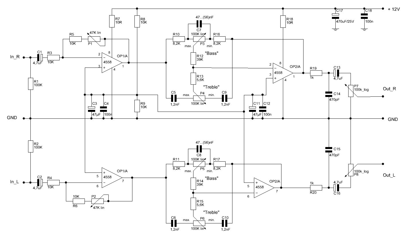 Az a másik hangszínszabályozó ugyancsak tuningra szorul, finoman fogalmazva. Ha nem kell erősíteni, akkor a trimmerek elhagyhatók (P1-P2), helyettük átkötés kell. A fokozat 10kOhm alatti bemeneti impedanciáját nem minden készülék, vagy fokozat fogja szeretni. A kimeneti jelszint potenciómétereinek 100kOhm-os értéke hibás, igen rossz eredő frekvenciamenet lesz utána, mérve is és fülre is. Ide 5kOhm, vagy legfeljebb 10kOhm-os hangerőszabályzó kell, ami még nem ront az átvitelen és nem disznólkodik bele a kimeneti impedanciaviszonyokba sem. Egy erősítőben az elejétől a végéig, az illesztésekre kell figyelni, mind az impedanciák, mind a jelszintek vonatkozásában, figyelve a megfelelő tápellátásra is. Üdv!