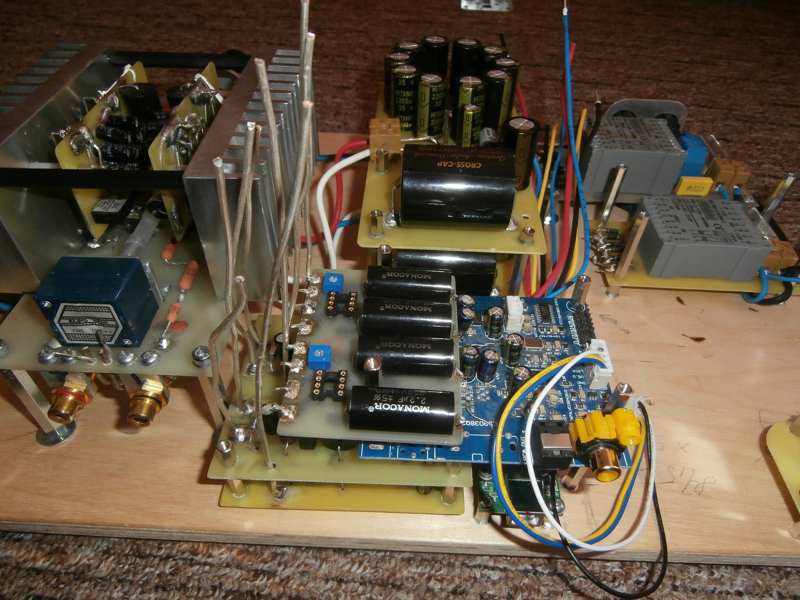 A történet 2018-ban indult. Király Tibor oldalán, DAC, mire füleljünk? témában olvashatók a részletei. Amikor Tibor beszerezte a ES9038q2m paneljét említettem neki, hogy kínálja magát az analóg fokozat a szétválasztása. Mivel nem hajlott rá, elhatároztam, hogy én biz megcsinálom. Én is megrendeltem egy YJ ES9038q2m panelt, és hozzá az egyik legjobb USB kártyát. Hamar kiderült, hogy a legjobb hang az I2s bemeneten van. Akkoriban készült egy próbalapon az első változat. (1,2 kép) Az analóg fokozatot lesöpörtem a hely miatt (3. kép), és Tibor által közölt szimmetrikus fokozatra bíztam azt (4.kép). Ez duál-monóban készült Burson V6 classickal. Ennek tápja 2x12V, 880uF+1x12V a digitális résznek. Akkoriban hasra ütéssel vettem a trafókat, így 2x17V lett a táp, és a prímér oldalra soros trafót tettem feszültségejtés céljából. Nagyot szólt a FH6-TB300-al, de kiszúrtam, hogy minden RCA kábellel változik a hangja. Kicsit, de amikor jó egy rendszer mindent meghallani. Telt az idő, és végre rászántam magam a múlt évben, hogy megépítem Tibor EVAmpját, és mint monitorerősítő a DAC része lesz, kiiktatva az összekötő kábelt, mint problémát. Azonban az EVAmp építése közben változtatásokra adtam a fejem, ami igen kedvező eredménnyel zárult. El is határoztam, hogy ami a tápokat illeti, hasonlókat építek a DAC-ba is. Az EVAmp módosított megépítése miatt EVAmp-ME nevet kapott, nehogy megtévesszek valakit a hangminőség kapcsán. Mivel is a FH6-TB300 sem úgy szólt, mint a FH6. Az es9038q2m dyers fórumon sok okosságot találtam a panel feljavítása ügyében. A Bursont is innen vettem. Ha majd ott tartok én is kialakítom ezeket a módosításokat. De én a testpontok szétválasztásával kezdem majd. Ezeket a földcsillagpontban fogom közösíteni. Mindenesetre látszik az alagút vége. A vezeték készítés nagyon fárasztott, így kénytelen voltam 40%-os védőitalt fogyasztani hozzá, hogy az esetlegesen menet közben kialakuló traumákat elkerüljem. A DAC táppaneljei sem sikerültek hibátlannak, ezért, meg azért… Hát kijavítva a felmerült problémákat, nem törődve annak küllemével, csak a cél lebegett a szemem előtt. A most már tapasztalatból megfelelő, 2x6 voltos Makraik kerültek bele. Ezek a Schottky diódákkal 12 voltot mutatnak sima puffer esetén. Jelen pufferek 1.100µF meg egy kicsi… lesznek. A dekadikus osztók is teret kaptak. Már csak be kell fejezni. Azonban még kérdés, hogy a panelközelségeknek nincs e mellékhatása…. A táp kialakítások az EVAmp-ME szerint. (5,6,7 képeken) Egységstruktúra (8,9,10,11 képeken)