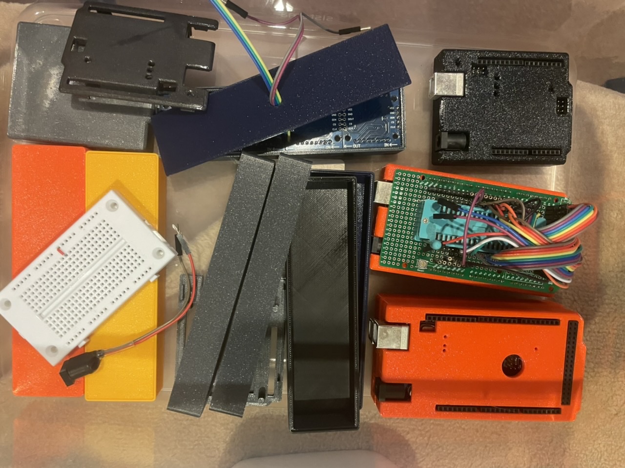 Az ora egyik esetben egy intel 8085-os procival epetett szamitogep (csak probapanelen, mint a kep sakaban latszik), a masik esetben egy arduino uno hajtja a dot-matrix kijelzot.