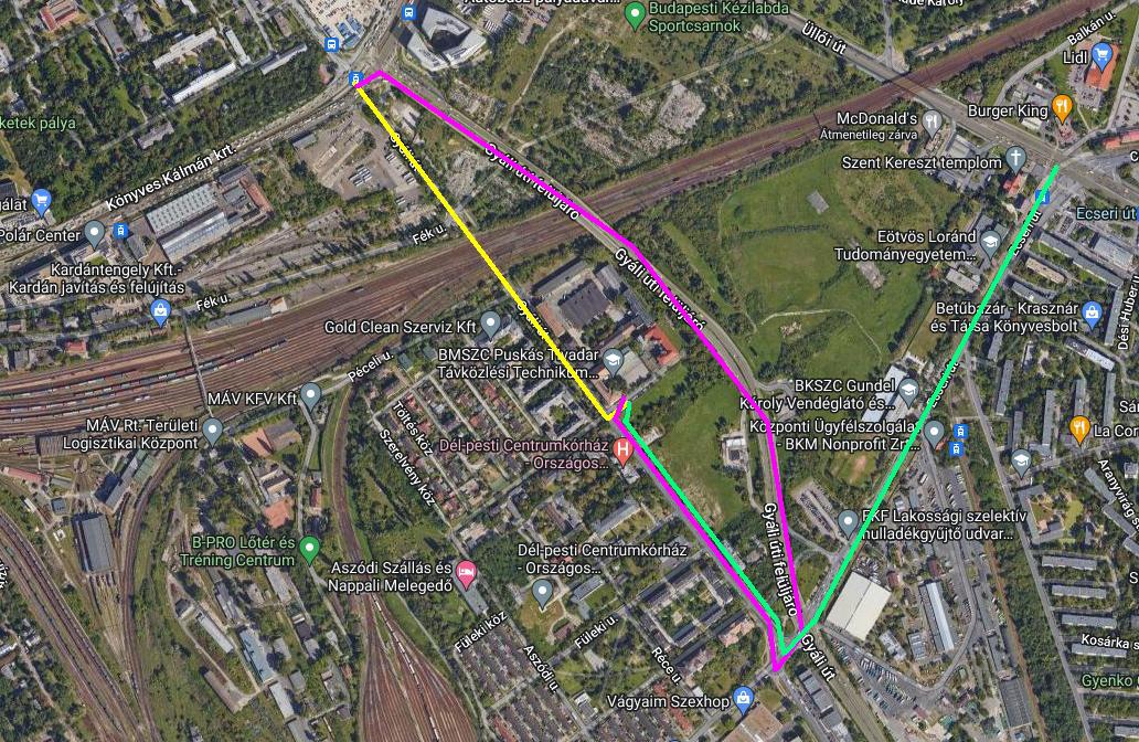 Lila: gyaloglás az 1-es villamostól felülljárón