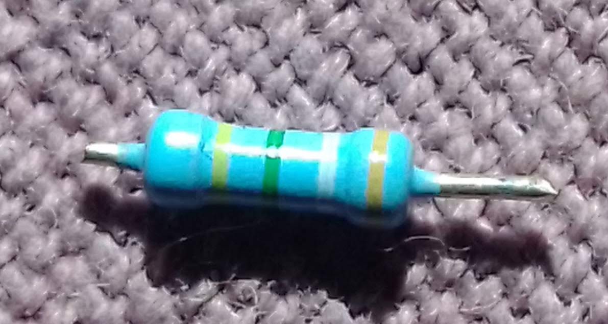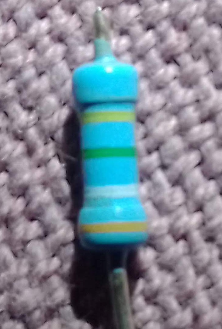nem tudtam megfejteni, milyen értékű ez az ellenállás. Sárga/zöld/fehér/barna a sor, ahogy én értelmezem, de ez nem szabvány.