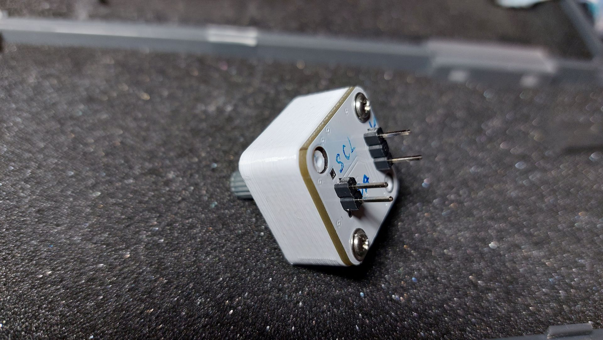 Szükségem volt hangoláshoz egy nem racsnis, finoman működő, nagy felbontású encoderre. Optikai kivitelben csak nagyot és drágát találtam. Találtam egy mágneses elven működő kis panelt az ebay-en, AS5600. Ez i2c porton adja le kb. tized fok felbontással a tengely helyzetét. A tengelyt (ami a mágnest tartja) kibelezett potméterből készítettem, a ház 3d nyomtatott.