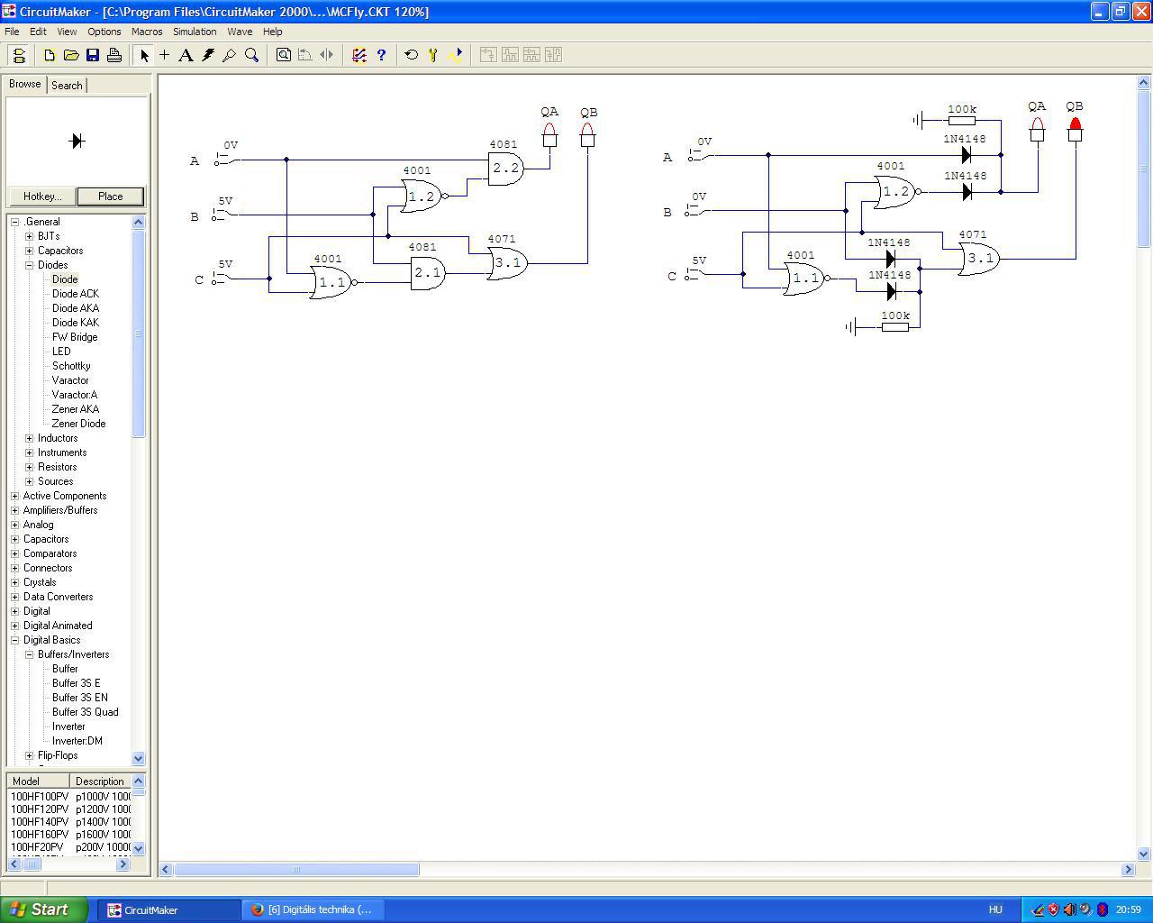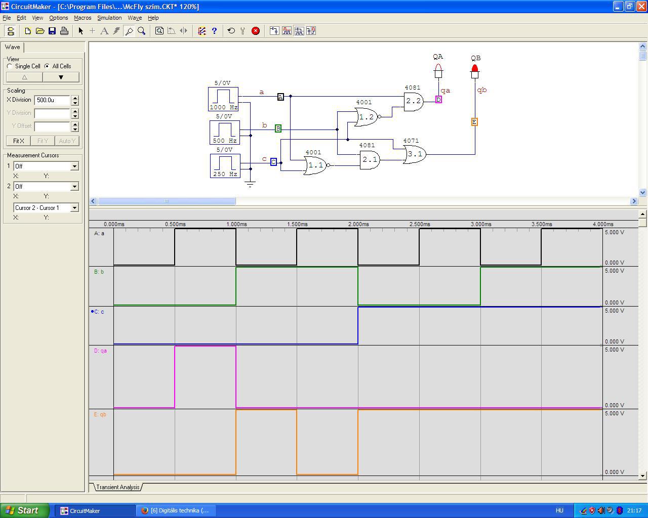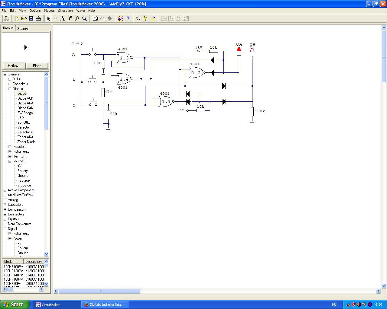Működik csak egy diódán keresztül vissza kell csatolni. Kipróbáltam és az SR tárolót is sikerrel megépítettem. Már csak egy kapcsolást kellene kifejlesztenem, de kb 2 órányi agyalás után úgy érzem hogy közzé kell tennem a feladatot mert valószínűleg valamit kifelejtek. A működése a következő: Adott A B és C bemenet, valamint A ki és B ki kimenetek. Ha A bemenet aktív akkor A kimenetet aktiválja, ha B bemenet aktív akkor B kimenetet aktiválja. A C bemenet szerepe hogy ameddig aktív addig minden esetben B kimenet legyen aktív. Ha alapból B volt aktív akkor nincs változás, viszont ha A aktív akkor a C bemeteten lévő jel átváltja és a jel fenntartásának idejére B kimenet aktiválódik. Ha C bemenet alacsony szintre vált, vissza ugrik A ki aktívba. Remélem nem bonyolítottam túl a megfogalmazást. 2010 ben iskolás éveim alatt álltam utoljára hasonló feladat előtt Nem kérem hogy oldjátok meg helyettem de legalább vezessetek rá! Köszönöm