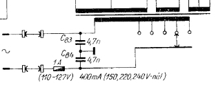 A hálózati búgás kiszűrése a két 50 μF-os elektrolitikus kondenzátor dolga (a rajzon B jelzéssel). Ezek egy henger alakú testbe voltak beépítve, de be lehet szerelni külön is a megfelelő bekötéssel, polaritással. Ha most nem búg a rádiója, ezeket nem kell cserélni. 2 x 50/350-est nem nagyon talál ma, de tökéletes a 2 db 47/450, ez könnyen elérhető és olcsó. (Ha most nem búg a rádiója, ezeket nem kell cserélnie.)