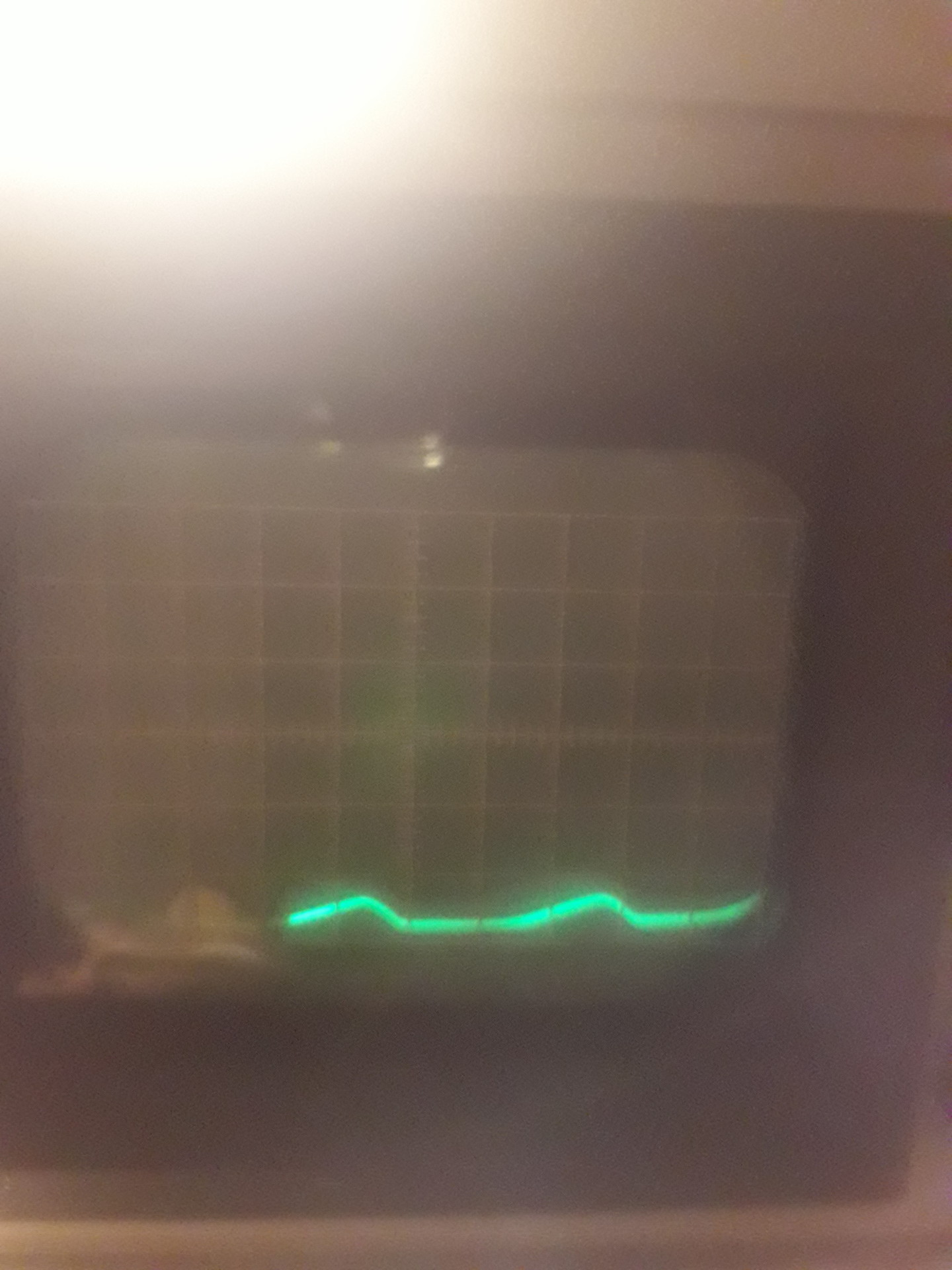 Csináltam képet róla, de csak telefonnal tudok. Remélem látszik. A sugár a közép vonalnál egyenes. Az X kapcsoló 30 ms/T állásban van. Ha a poziciónáló pométerrel a függőlegesen eltolom a vonalat, akkor látszának a kis jelalakok. 3 ms/T felett már csak több sugárnyalább látszik, gondolom a brumm szinuszjele.