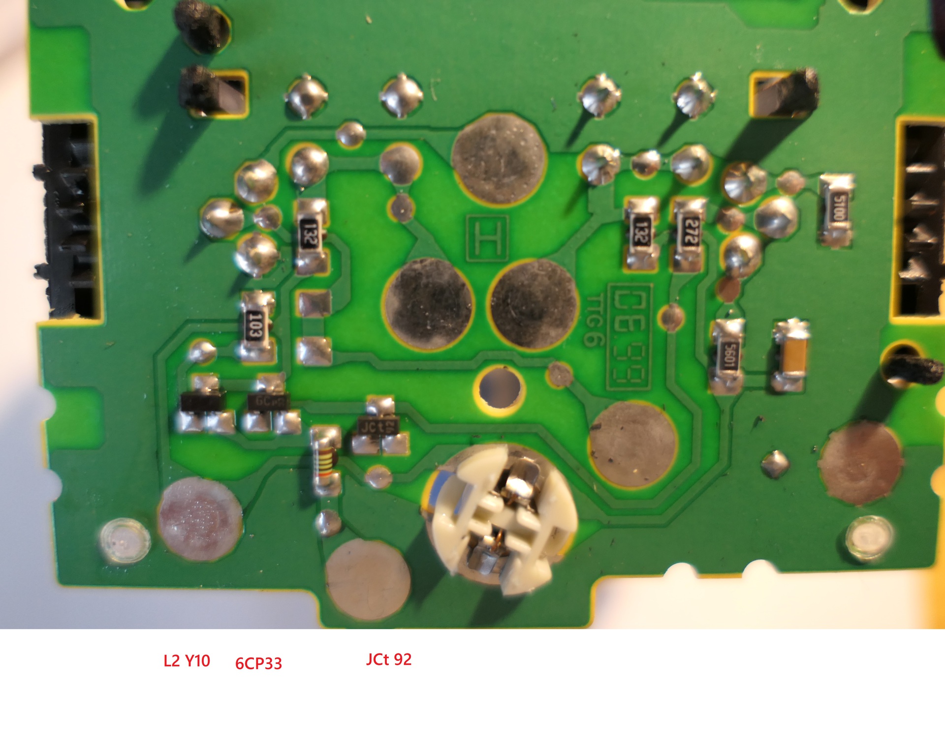 A képen egy opel astra vivágítás kapcsolójának a panelje látható! Egy zárlat után a két potméterrel állítható dolgok nem működnek, fényszóró magasság és a műszerfal világítás, valamint a ködzárófény nyomógombos kapcsolója nem húzza be a relét! A három kis SMD alkatrész mehetett tönkre talán, odaírtam a kép alá, hogy mi van rájuk írva. Ez alapján lehet esetleg tudni, hogy ezek mik lehetnek? Valamint a kis hengeres színkódos alkatrész micsoda lehet? Én ellenállásra gondolnék, de miért nem olyan kerülhetett oda, mint a többi fekete!? A 2db 3as kőr alakú forrasztásnál van a két trimmer potméter.