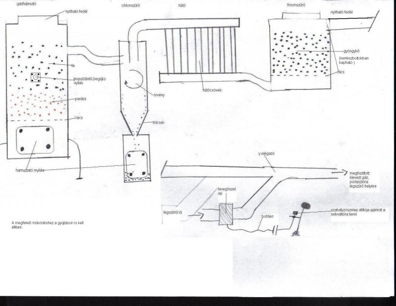 Ez a fagázgenerátor, amit ezelőtt 24 évvel láttam, de még mindig látom magam előtt a lelki szemeimmel, készítettem róla egy rajzot, amit el is küldök. Ez a generátor többórás üzemre készült, mert indulás előtt elő kellett állítani a 25 cm vastag parázs réteget, ami a fagázból kiégette a kátrányt. Ezt valószínű, úgy állították elő, hogy meggyújtották benne a tüzet, és tüzeltek, míg lett 25 cm parázs. Bezárták a hamuzó ajtaját légmentesen és raktak fát a parázs tetejére. A parázs a fát nem tudta lángra lobbantani, mert fentről ment a levegő lefelé, a motor által előállított vákuum hatására. A fa melegedett, gázosodott, de nem tudott lángra lobbanni. A fagáz egyenesen vezetett a motor szívó torkához, ahol egy billenő lemez segítségével lehetett állítni a gázadagot. Arra már nem emlékszem, hogy az előállított gázhoz kellett-e még levegő, vagy konyhakész állapotban szállítja a generátor a motornak, de nem nagy ügy kipróbálni, ha már van fagázgenerátorunk. Sokat nem fogyasztott, mert valahol a lisztes malom fagázzal működött és a gazda kellett vigyen 3-3,5 kg tűzifát is, amikor ment búzát őrölni. Ha valakinek még van valami kérdése, tegye fel, ha tudom megválaszolom.