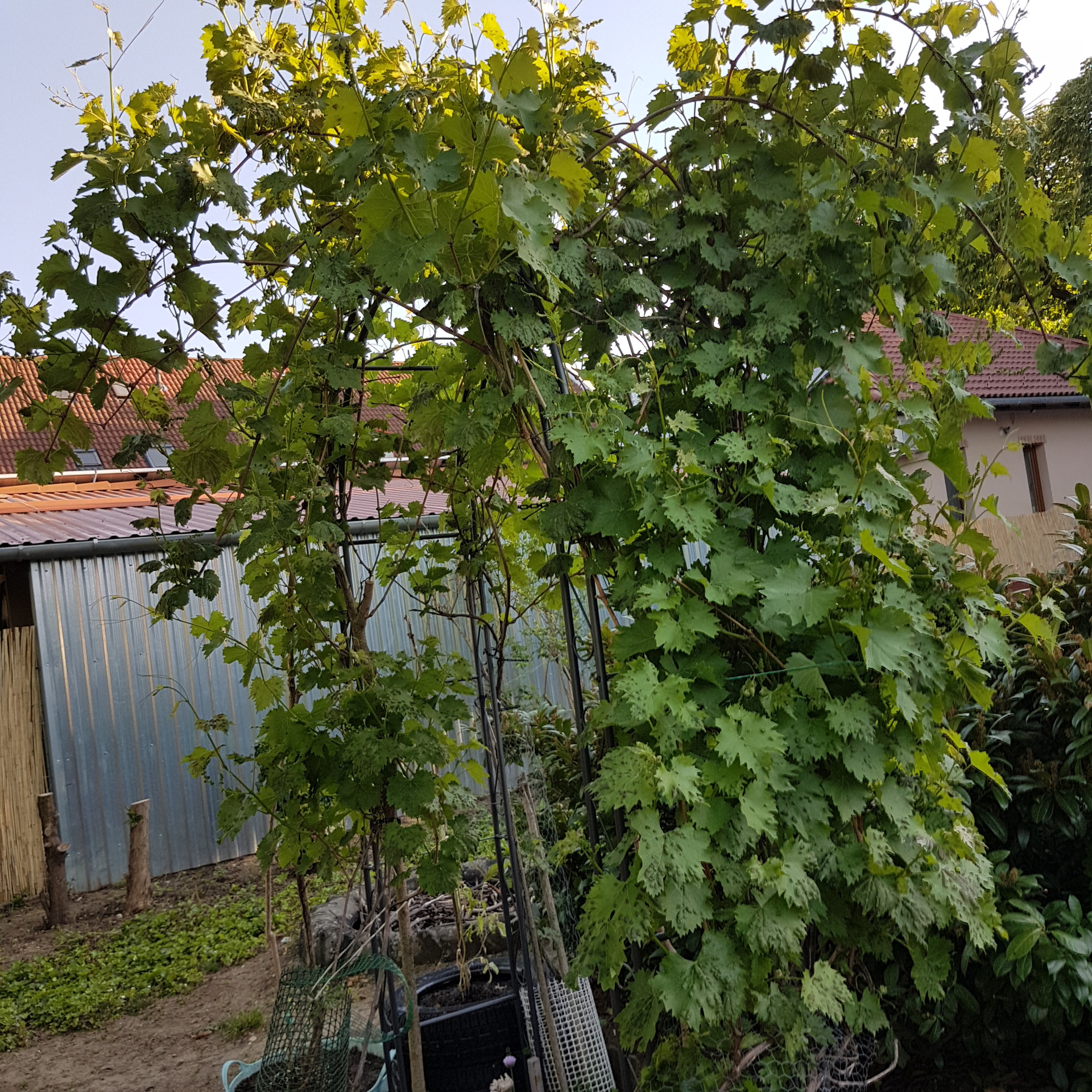 Kékes színű termést adó szőlő fajta, akitől a tövek vannak, az azt mondta, hogy nem kell permetezni, mi pedig elhittük. A közeli képen látható, hogy a levelek beragyásodtak, és tavaj a ragyás levelű tő kevesebbet termett a többinél, de idén már mindegyik tő egyformán ragyás.