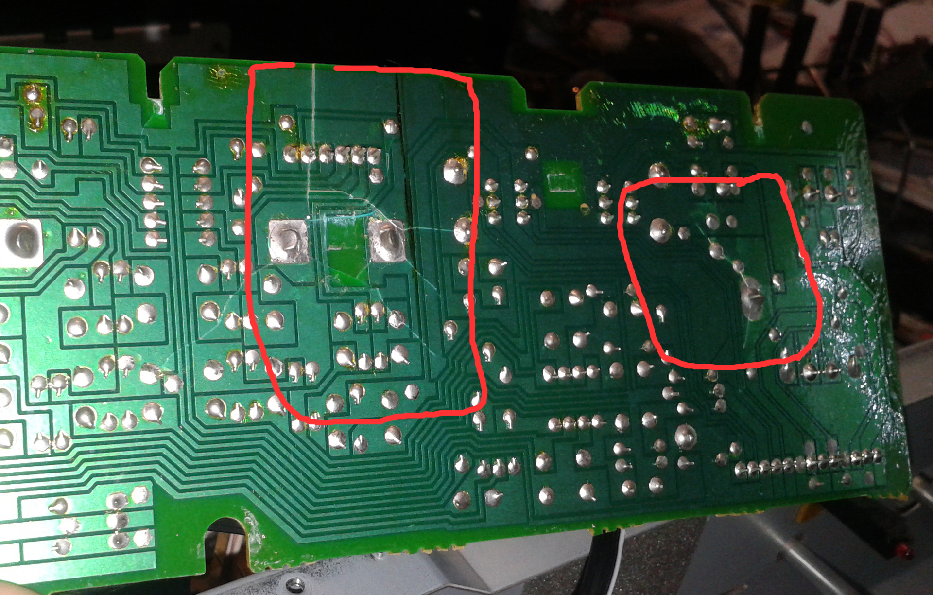 0.2mm-es huzallal kezdtem áthidalni a repedt részeket, előtte letisztítani a forrasztásgátló fedőfestéket. 1-2 óra után tűnt fel, hogy az egyik hangszínszabálozó tengelye is kicsit ferdén áll. Nagyító alatt felfedeztem újabb fél marék repedt sávot, valamint a 6 kivezetéses (sztereó) poti bakelit része és ezzel együtt az ellenálláspálya egy része szintén elrepedt.