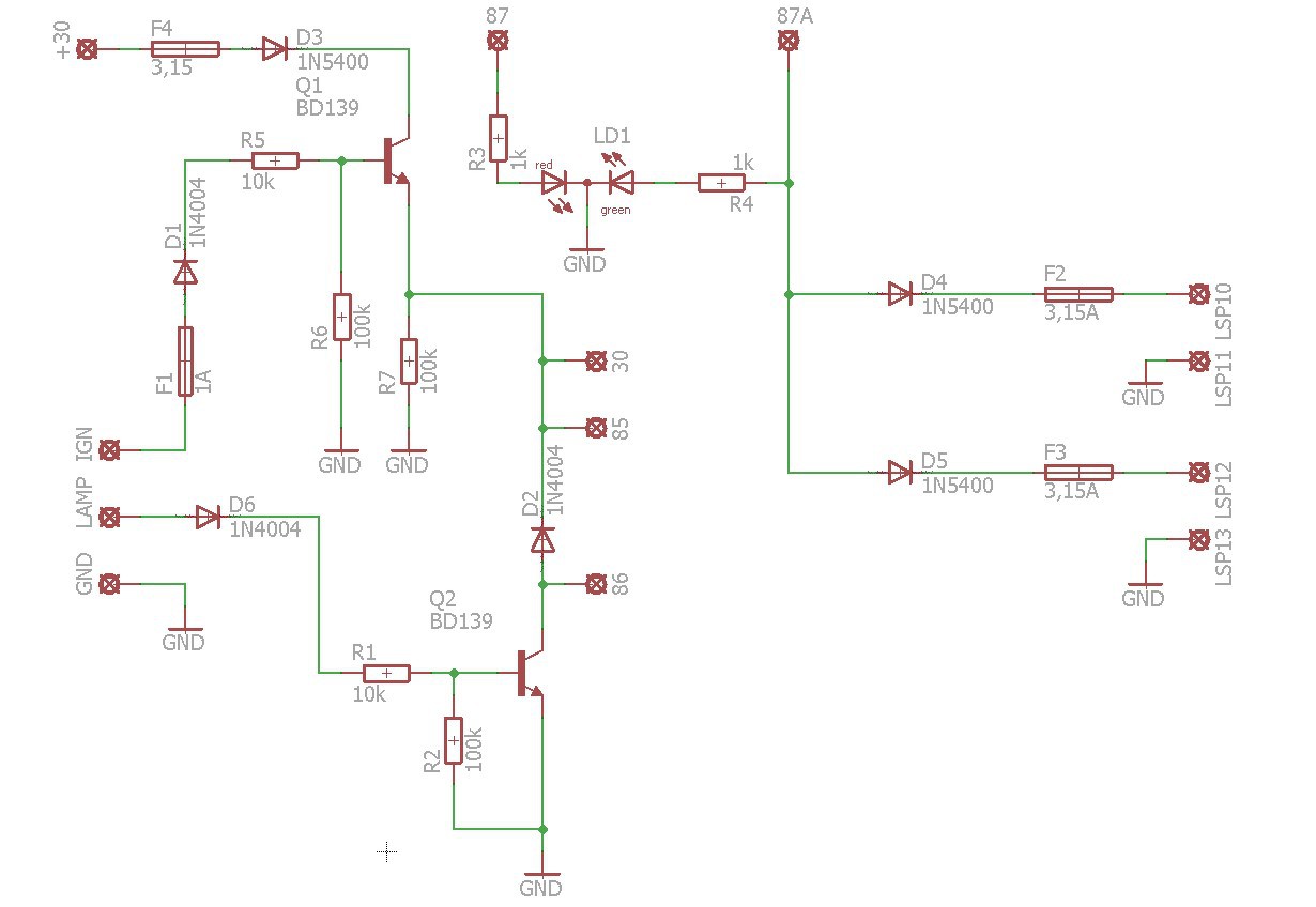 Szerettem volna csinálni egy nappali menetfény kapcsolót. Segítenétek megkeresni a hiba okát? Az alap koncepció, hogy - a ki és bemeneteket védem diódával és biztosítékkal - a +30 pont az állandó 12V, melyet az IGN pontra érkező jel kapcsol. Ekkor felkapcsolódnak az LSP10-13 pontokra kapcsolt lámpák és a visszajelző led zölden. Ha itt megszűnik a jel, lekapcsolnak a lámpák. - a LAMP bementre érkező jel hatására meghúz a relé (autós relé, 85 és 86 pont a tekercs, 30 be, 87a az állandó ki, 87 a kapcsolt kimenet) és a lámpák lekapcsolnak, a visszajelző LED pirosan világít. Összeraktam a kapcsolást és követő jelenséggel találkoztam. Addig minden jó, hogy a bejön a +30 ponton az állandó 12V és máshol nincs feszültség. Az IGN potnra 12V-ot kapcsolva mérhető feszültség a kimeneteken de már kb. csak 9-10V, és ha a LAMP bemenetre is 12V feszültséget adok, akkor leesik a mérhető feszültség kb. 5-6 V-ra kimeneteken és a relénél. Így a relé már nem tud behúzni, hallani, ahogy próbálna behúzni, de még nem tud. A bemeneten (+30 pont) továbbra is 12V van. A visszajelző DUOLED egyelőre nincs bent Szerintetek mi lehet a nagy feszültségesések oka? A tranzisztorok bázis ellenállásainál szúrhattam el valamit? Köszi a segítséget előre is! Üdv,