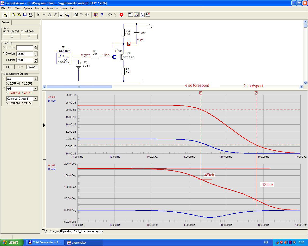 Most az is látszik (a fázismenetből), hogy bár ez egy egyfokozatú feszültség erősítő, de két töréspontja van. Egy bemeneti és egy kimeneti. Van még 3. is, de az már annyira magas frekvencián, hogy nem foglalkozunk vele.