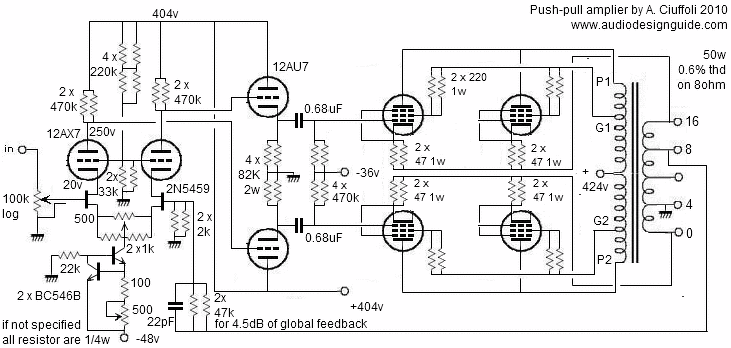 Nézd meg, hogy nem javul-e valamelyest a helyzet ha kicseréled a rácsok előtt lévő 2k2-ket 100 ohmokra. Na meg a leglényegesebb dolog egy csöves építésénél hogy mi a cél. Ha egy kellemesen színező hangzásra vágysz akkor nincs nagy baj a rajzzal (kérdés, hogy a cikkírónak valóban jól működött-e), viszont ha jó hangú, a valóságos hangzást közelítő erősítő a cél, akkor alapvető a végcső katódból hajtása, lásd Ongaku, EAR, stb. vagy pl. PP-ben a Luxman MQ-80 ami valószínűleg szintén nem lehet rossz, ha a közel 50 éves erősítőért ennyit el mernek kérni.
