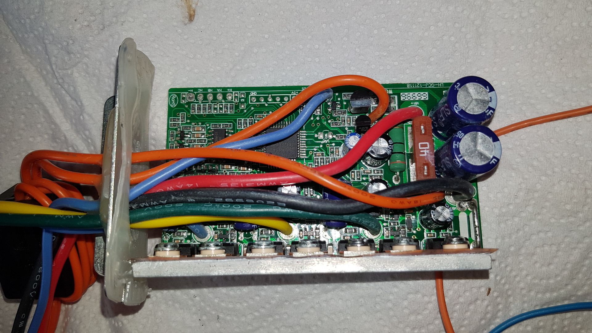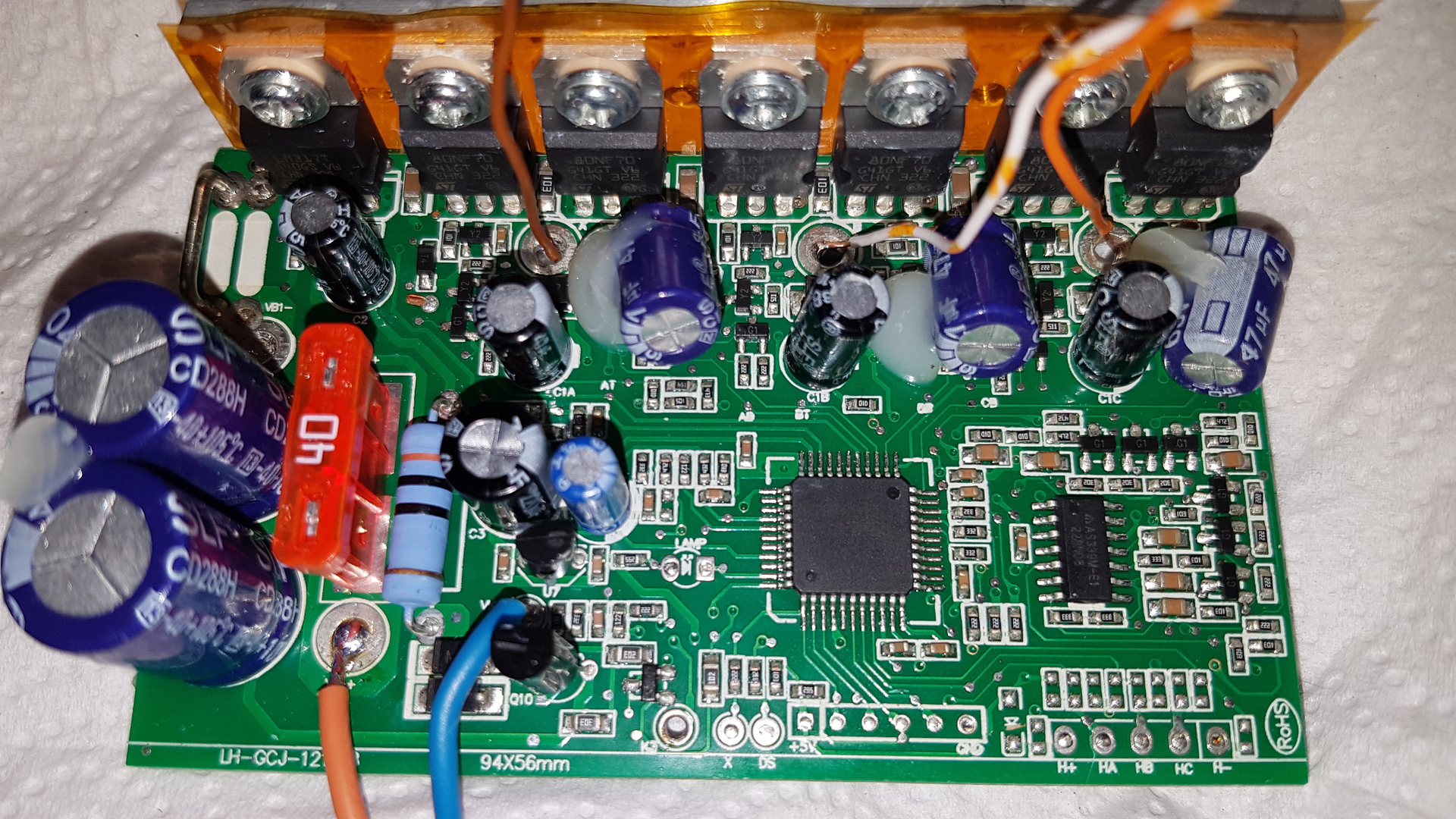 Van egy (pontosabban 2 egyforma) fűnyíró BLDC motor vezérlőm. Mindkettőnek látszólag ugyanaz a hibája. 3 csatlakozó van rajta: akku, motor, kapcsoló.( képek lent). 7S akkupakkról üzemelt, ezért olyan 27-28V on próbálom, de igazából olyan mintha motorfék lenne csak, ha bekapcsolom, a Fet-ek nem zárlatosak. LM317-el előállít 13V-ot, az megvan, illetve az MCU-nak is megvan az 5V-ja, ha a kapcsoló szálat összezárom A motornak csak 3 kivezetése van, nincsenek szenzorjai. Nem tudom merre induljak tovább, illetve mit nézzek még meg. ( a képek vegyesek a "sok" vezetékes az egyik vezérlő, amibe pedig kevés vezeték van az a másik vezérlő). Olyan mintha nem indulna el a vezérlő, vagy nem is tudom, vagy csak fékez, mert ahogy bekapcsolom el se indul, és ha forgatom akkor nehezebb forgatni ( gondolom ez a fék). Segítséget köszönöm. Szerk.: Motor valószínű működik, mert egy másik motorral is ugyan ez a helyzet. A hozzászólás módosítva: Jún 8, 2022