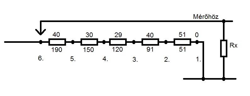 - majd a szintnek megfelelő értékű ellenállás (a 6 lehetséges ellenállás közül kiválasztva) egyik végét a kijelző vezetékére, másik végét egy fet-en keresztül a GND-re kell kötni. Mindig az aktuális szintnek megfelelő ellenállás+FET -et kell működtetni.