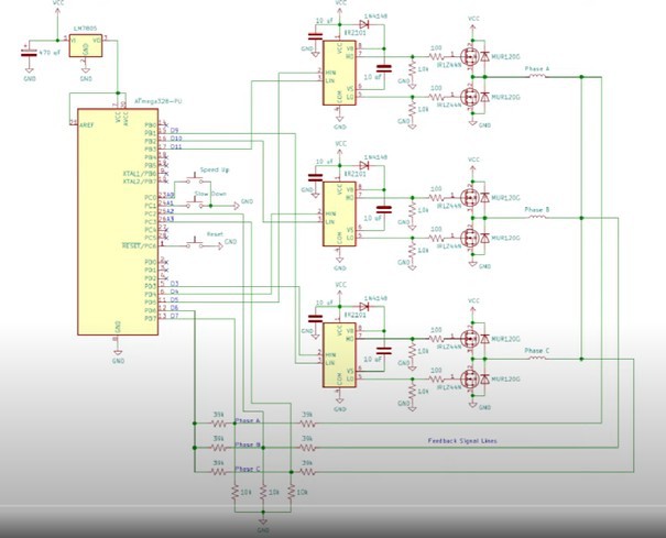 Most ott tartok, hogy arduino-hoz néztem valami BLDC motor vezérlő programot, de mindegyikhez van valamiféle vezérlő, Gate meghajtó IC ( mint a te kapcsolásodban is IR2103), ami gondolom vezérli a 2 FET-et illetve ha helytelen vezérlés jön akkor nem engedi egybenyitni... (Na nekem ilyen nincs), helyette szimplán feltöltöttem a programot, tettem rá egy potit majd próba.