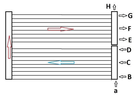 Ha nem tetszik akkor mellékelem a következő ötletemet, itt nincs középső osztó-gyűjtő, hanem a csöveket hurkolod át, itt "a" a betáp és "H" az elvétel. Ha maradsz az eredeti tervnél. akkor is "a" - "H". Gondolatmenet: Állandósult rendszerben az alsó fél egy-egy csövének nem változik a tömegárama, tehát nézzünk csak egyet, hogy merre mehet belőle tovább a víz. A folyadék a legrövidebb úton akar kijutni a rendszerből, tehát egy "E" kifolyó pontnál, az azzal szemben levő vékony csőben lesz legnagyobb az áramlás. Ha "H" a kifolyó pontunk, akkor a felső szekció bármely csövén folyik át a víz, ugyanaz az úthossz. Ezt megpróbálom a második képen ábrázolni. Csak két utat rajzoltam be, de belátható hogy így minden irányba az úthossz az kétszer a vízszintes ág (a rajzhoz képest) és egyszer a függőleges. Kicsit keszekusza a leírásom, de remélem érthető.