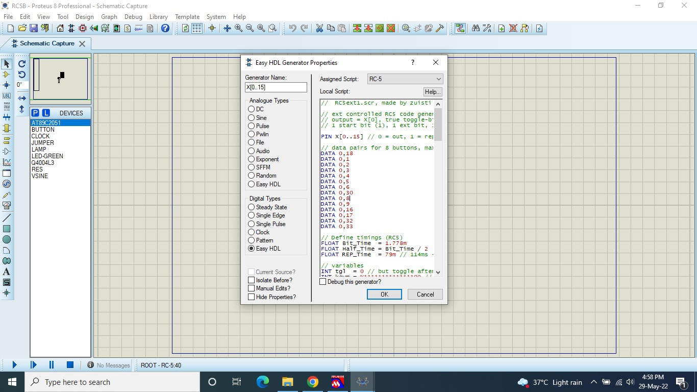 One more question please, can I test with ir remote in proteus, it has ir nec protocol, I have not ir nec transmitter in proteus,but I have Rc5 EasyHDL script generator,it can generate rc commands,easyhdl rc5 code attached,kindly make changes it for nec protocol;