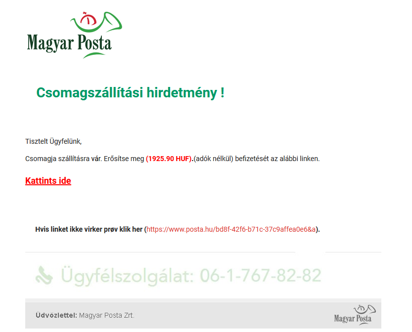 Meg is nyomtam a "spam" gombot az email felületemen, hogy megjelöljem, azonnal áthelyeződött abba a kategóriába. Majdnem jó volt, de az URL-ek gyanúsak voltak és az utolsó sor lefordítatlan maradt, ami jobban növelte a gyanússágot, ráadásul a pénzösszeget is "HUF" tüntették fel "Ft" helyett.