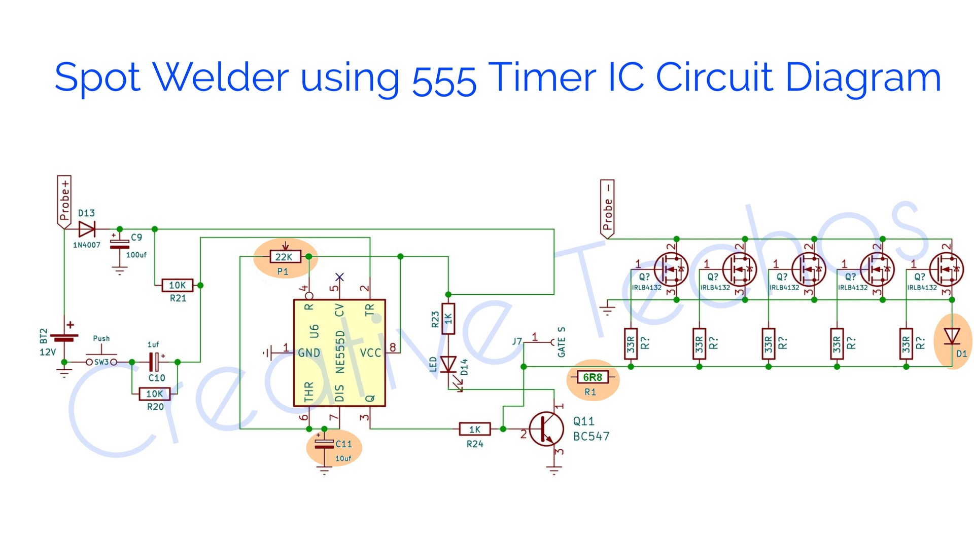 Az alábbi ponthegesztő kapcsolást szeretném elkészíteni. A Mosfet lehet IRLZ44N is változtatás nélkül? Még 1 diódát tett a fetek 1-3 csoport lábaira. Ha jól tudom ez 50 ms időzítésű. Melyik R tagot kell potméterrel helyettesíteni és milyen értéken, ha 10-200 ms időzítés között állítható lenne?