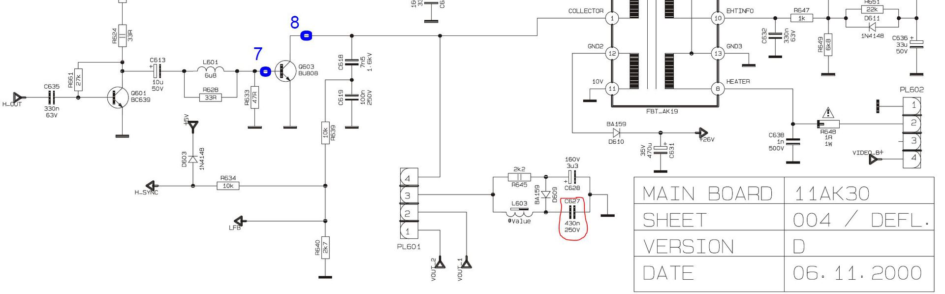 Rendben. Közbe kiforrasztotam a kis trafót, nem szakadt, és nem is zárlatos.A 2SC2500 T402-es is jó. Kondik jók a környéken. A C412 100 nF-os, a kapcsolási rajzon pedig 27 nF-os van.