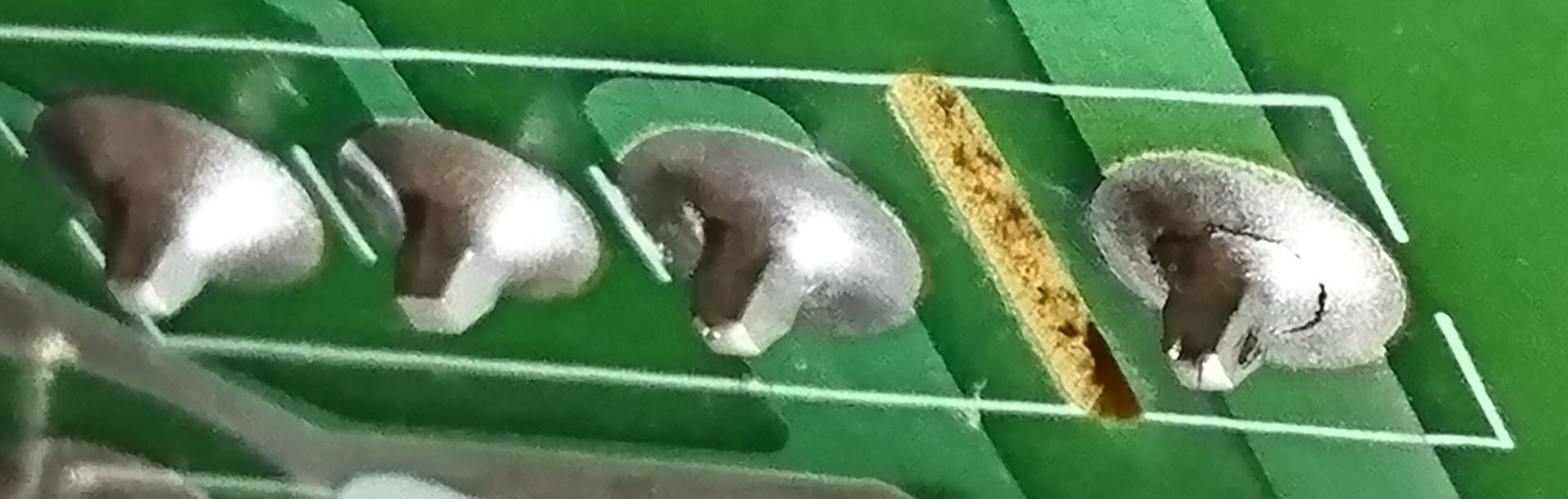 Aztán tovább nézve még volt PL601 csatinak a lábán is és még egy kondinál is látszódott már a repedés, de még nem volt eltörve.
