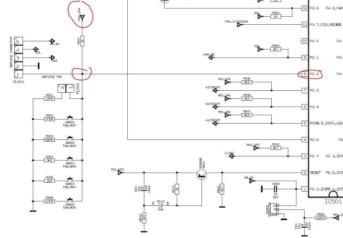 Az IC501 8-as P0.2 lábára megy a jel valamint mérhető a szerviz csati 1-es lábán is. Itt mértem látszólag jó, gombnyomogatásra is változik mint az ellenállás érték, mind a feszültség érték.