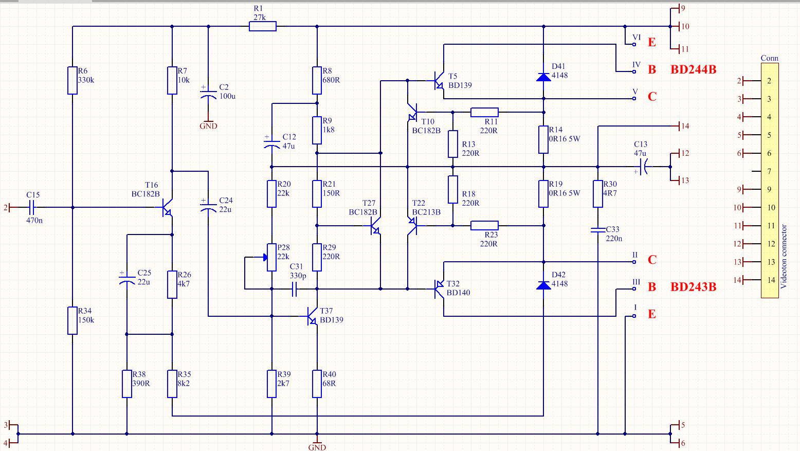 A 8k2 csak a kimenetre van kötve, VD42 anódja viszont nem a kimeneten van, hanem a GND-n.A BD140 emittere meg közvetlenül a végtranzisztor bázisára megy, nincs a 0.16R-re kötve.