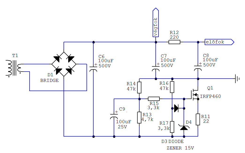 Ha pontosan megírod mekkora az erősítő áramfelvétele, valamint mekkora a be illetve igényelt kimenő feszültsége, akkor valamint milyen fetet fogsz használni, akkor pontosan kiszámolom a szükséges ellenállásokat. Tulajdonképpen két ellenállás értéke a lényeg. R13, R14. Ezek állítják be a feszültségejtést de ez áramfüggő, ezért kellenek az adatok.