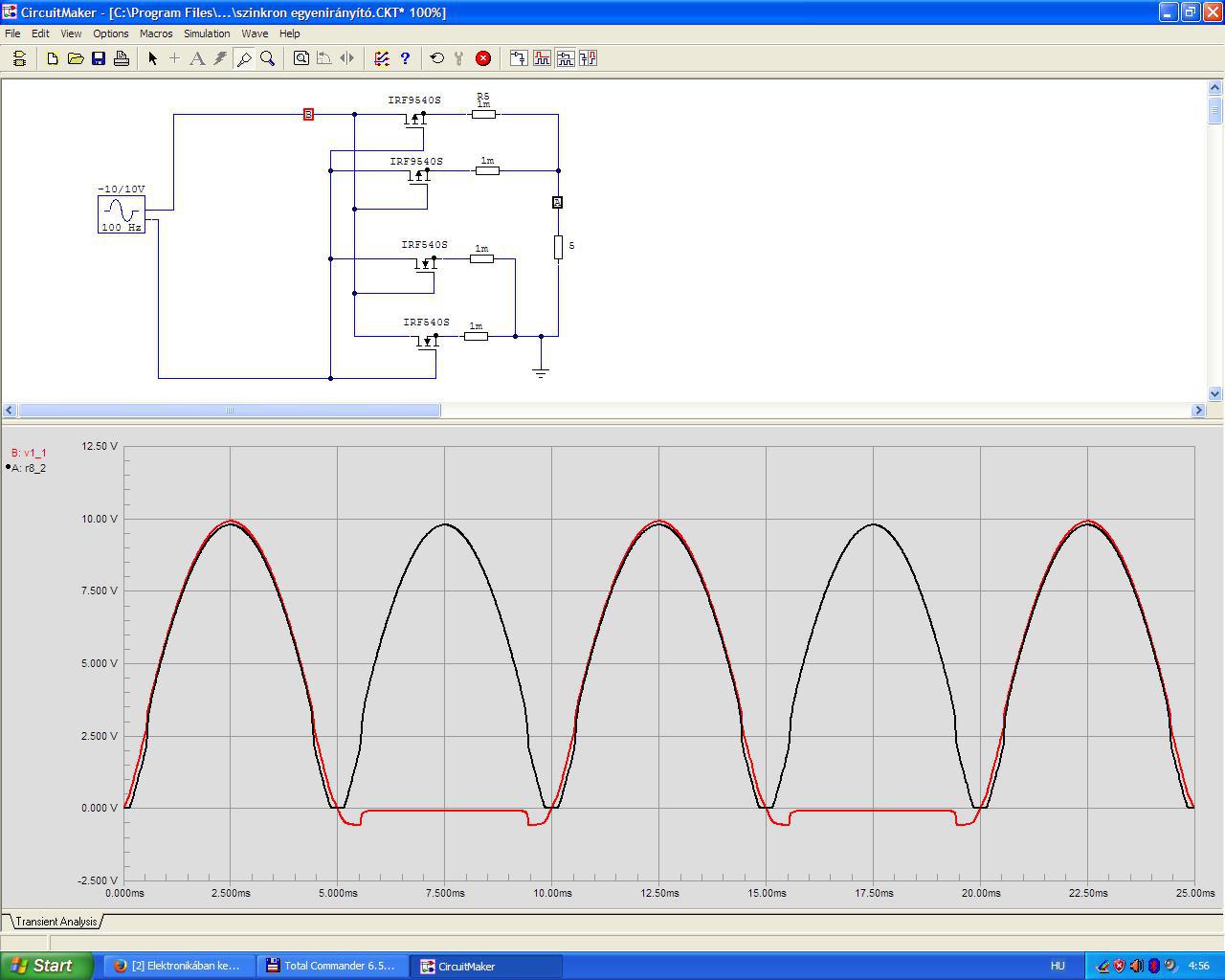 A bringalámpás cikkben említettem a szinkronegyenirányítót, nagyjából mint ami a szimulációdban is van, tényleg egyszerű, csak pufferrel a kimenetén nem használható, mert visszafelé is tud folyni az áram.