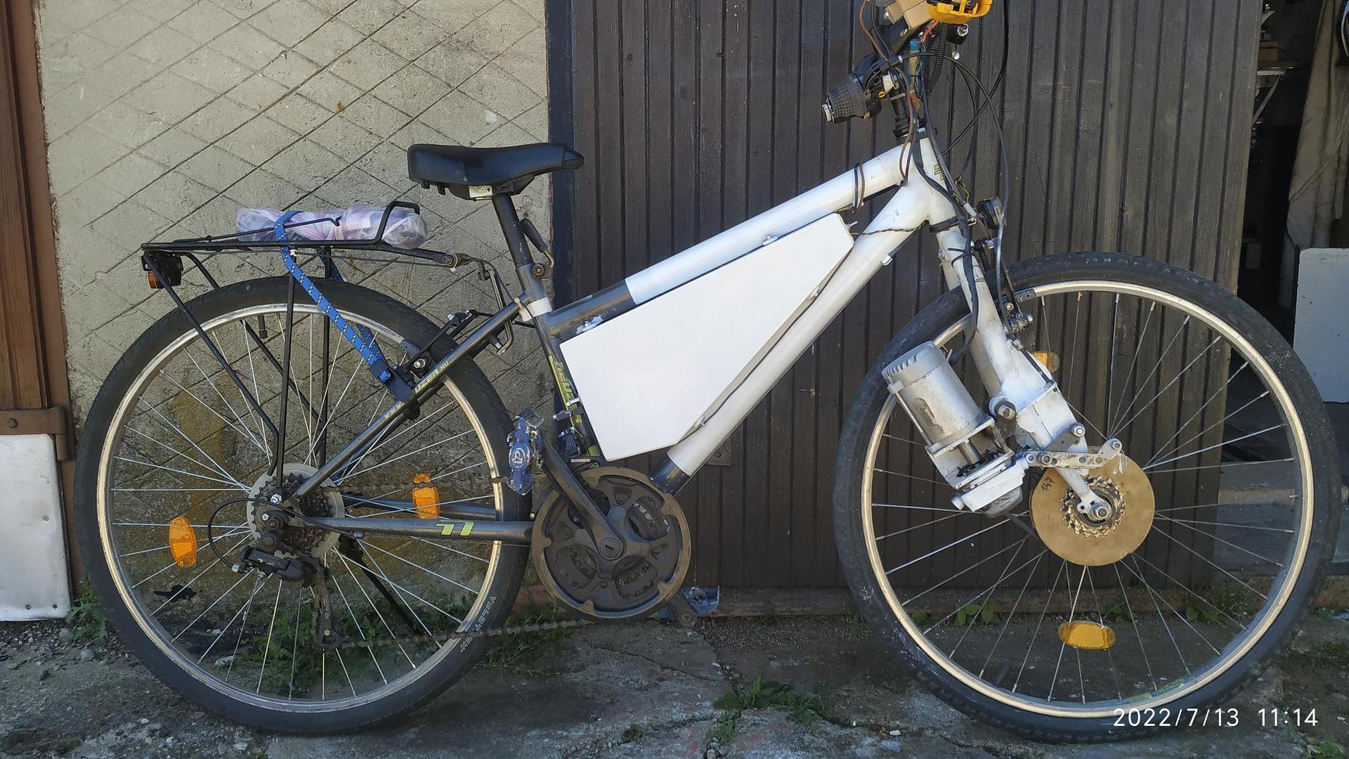 Sziasztok. A korábbi bringámon fejlesztettem egy-két dolgot. Még nincs kész, pontosabban tönkre ment a fúrógép szabályzóm, de ezt leszámítva ilyen marad. Hátha kedve lesz valakinek ehhez hasonlót építeni. Bár a kormány elé már felkerült egy fekete bringás kosár.