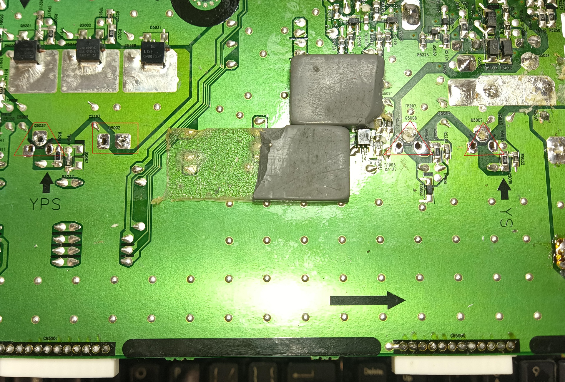 Üdv. Vettem alkatrésznek egy PS51F5500 plazmát. Szétszedte látni hogy X és Y lapok is javítva voltak. A Tv tápja STBYből bekapcsolva zárlat miatt rögtön kikapcsol. X panelen hibát nem találtam, Y panelen zárlat. A panel LJ41-10317A A fekvő hűtőborda alatt mértem az egyik alkatrészt zárlatosnak. (azt hiszem tranzisztort).. Mikor kiforrasztottam a hátőbordát, kicsit felhajtottam a 4 alkatrészt (3 tranzisztor/IGBT és dióda) akkor mérve mindegyiket, egyiken se találtam zárlatot. Ez a 4 alkatrész már volt cserélve, de nagyon kókány módon. (nagy csimbók forrasztások) Még az is lehet, hogy amikor a zárlatot mértem az egyiken, lehet a forrasztás ért össze. A négy alkatrész Q5037 D5002 Q5008 Q5007.