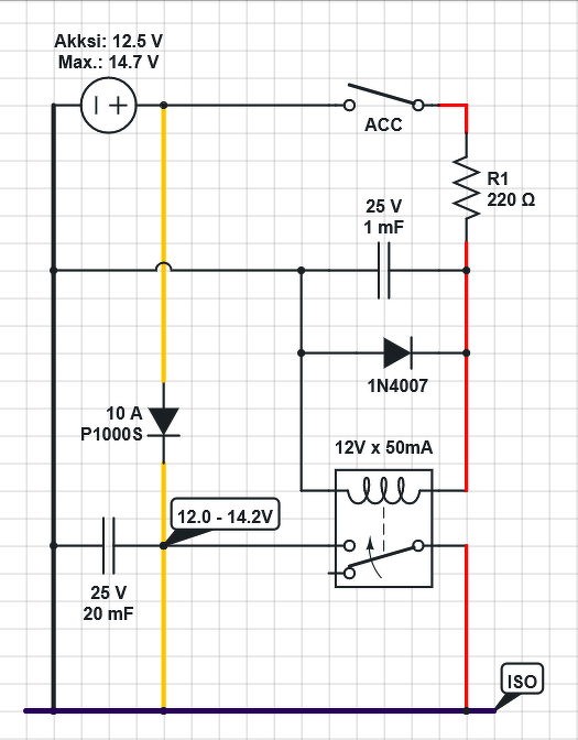 Csináltam egy editorban ehhez kapcsolás. Ez már egy 2.0 verzió. Már kipróbáltam, hogy ha a sárga érre rakok diódát + 20000µF puffer kondit, akkor 5-6 m.percig tartja a 12 voltot és nem kapcsol ki a rádió. (Szerencsére kell IDE - ISO átalakító, így ezt vagdosom szét, nem az autó gyári kábeleit...)