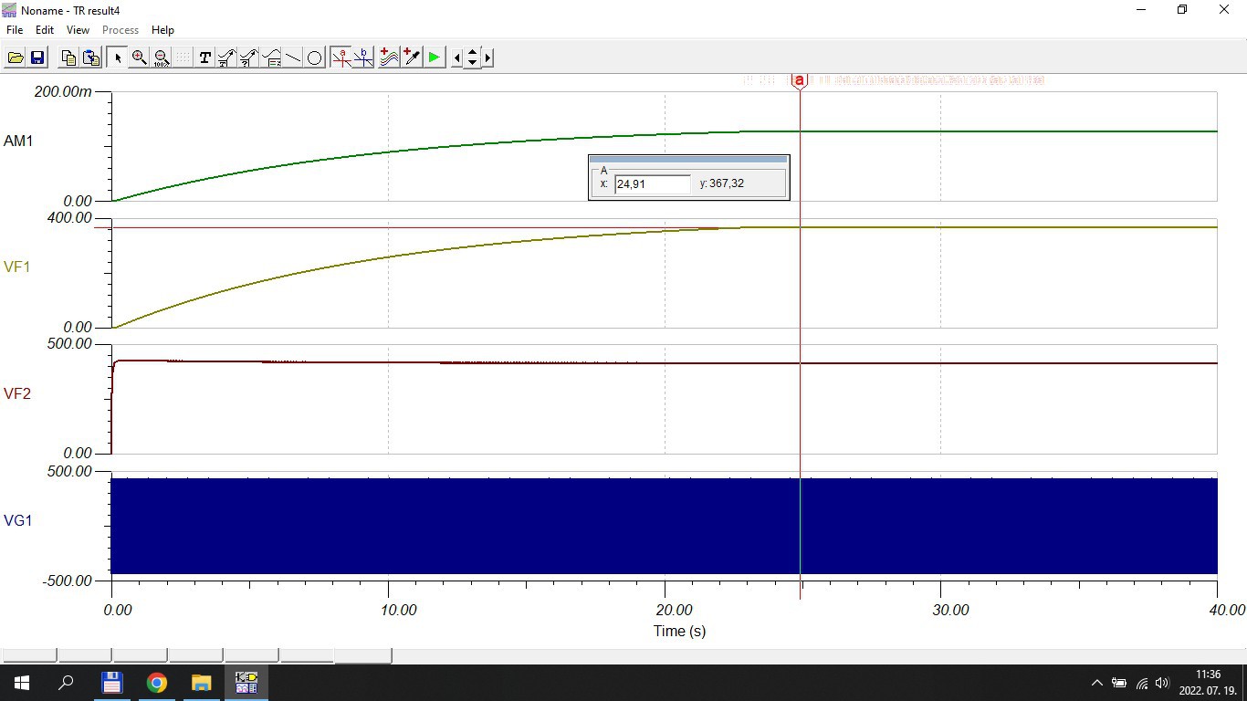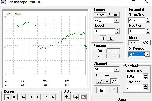 Jó. Valahogy így kell neki kinézni a gyakorlatban is ha 130mA körül van a terhelés. A VF1 a kimenet, kb. 25s alatt éri el a teljes tápfeszt. A szkópon meg a 100Hz-es búgófesz van ami 50uV nagyságendű szóval ezzel egyáltalán nem búghat.