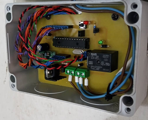 Az első képen látható jobb oldalába kell csatlakoztatni egy tápkábelt ‒ olyat, mint a számítógépekbe ‒, a második képen látható bal oldalában lévő lapos aljzatba lehet csatlakoztatni a kapcsolni kívánt eszközt, amit a mozgásérzékelő kapcsolgat. A tetején lévő nyomógomb a kapcsolt szál helyett a bejövő fázist teszi a kimeneti aljzatra amíg nyomva tartják, így tesztelhető, ami oda lett csatlakoztatva. A tetején az a fekete kupak egy üvegcsöves biztosíték foglalat, a fázis ezen keresztül jön be. Mivel nem nagy, így ez a doboz bárhol elhelyezhető, ahol stabilan lehet és mozgásérzékelős kapcsolást szeretne az ember, bármiféle módosítás nélkül.
