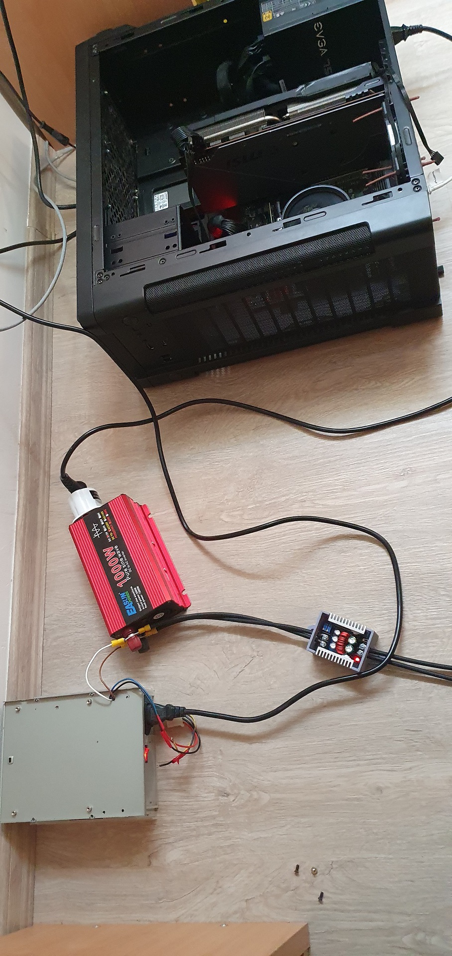 Mellékelek egy képet az összeállításról meg egyet a táp belsejéről. 12V ág van az inverterre kötve (fehér vezeték) + föld (barna).