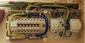 Fogyasztásmérőhelyről a PE vezető a bal oldali tábla bal alsó sín balról 8. csavarhoz érkezik (6-os kismegszakító mögött látható). Ugyanezen sín 12. csavarjáról a PE vezető a középső tábla bal oldali sín 1. pontjára érkezik. Ugyanezen sín 6. pontjáról a PE vezető a jobb szélső tábla bal oldali sín 2. pontjára érkezik. Ugyanezen sín 3. pontjáról a PE vezető ugyanezen tábla bal felső ("elmenő PE vezetők) sín 10. pontjára megy. N vezetők: Fogyasztásmérőhelyről a N vezető bal oldali tábla jobb alsó sín balról 2. pontjára érkezik (6-os kismegszakító mögött látható). Ugyanezen sín 6. csavarjáról a N vezető az ezen táblán levő FÍ-relére megy. Ugyanezen sín 10. csavarjáról a N vezető a középső tábla FÍ-reléjére megy. Ugyanezen sín 12. csavarjáról a N vezető a jobb oldali tábla FÍ-relére megy. Mindhárom FÍ-reléről az illető tábla jobb oldali, "elmenő" N sínekre csatlakozik. Szerintem a sínek egy közös pontból "vannak megtáplálva", és nem felfűzve. Nem könnyű a képről követni.
